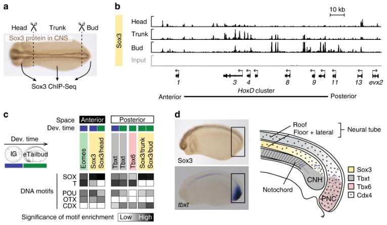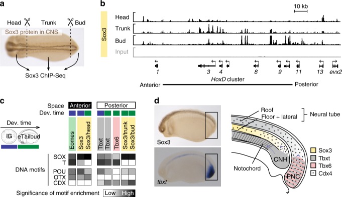 Fig. 5. Profiling chromatin for Sox3 in different anteriorâposterior compartments of the central nervous system (CNS). a Experimental design: Genome-wide Sox3 profiling of head, trunk and bud dissected from early tailbud embryos after tissue fixation. b Snapshot of Sox3 binding to HoxD cluster in the head, trunk and bud. Note the differential binding of Sox3 with âanteriorâ, âmiddleâ and âposteriorâ Hox genes being preferentially occupied in head, trunk and bud, respectively. c Heat map shows the significance of DNA motif enrichments (y-axis) across 10,000 pCRMs most frequently occupied in each chromatin profile (x-axis). Profiles are grouped depending on whether the cells expressing the TF of interest preferentially contribute to the anterior or posterior compartment. Abbreviations used for the developmental timeline: lG, late gastrula; and eTailbud, early tailbud. d Anatomical map of TF expression at the posterior end of an early tailbud embryo to explain the co-enrichment of âposteriorâ TF-specific DNA recognition motifs in c. Sox3-expressing cells of the posterior neural tube originate from the chordoneural hinge (CNH) and posterior wall of the neurenteric canal (PNC) expressing Brachyury and Brachyury/Tbx6, respectively21. Both neural tube and PNC are also exposed to the expression of Cdx such as Cdx4101 |
