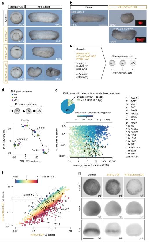 Fig. 6. Synergistic relationship between maternal Pou5f3 (mPouV) and Sox3. a Morphological phenotypes caused by single and combined LOFs of Sox3 and mPouV when control embryos reached mid-gastrula and mid-tailbud stage. See also Supplementary Movie 1. b Phenotypical rescue of mPouV/Sox3 LOF embryos by the co-injection of both X. laevis Pou5f3.3 and Sox2 mRNA alongside mCherry mRNA as a tracer. c Experimental design: Profiling the poly(A) RNA transcriptome (nâ=â3 biologically independent samples) over three consecutive developmental stages under indicated conditions. Abbreviations used for the developmental timeline: MBT, midblastula transition; lB, late blastula; and eG, early gastrula. d Biplot of PC1 (accounting for 86% variance) and PC2 (8% variance) shows the relationship of developmental stage-specific poly(A) RNA transcriptomes of control and α-amanitin-injected embryos in biological triplicates (#1â3). e Detection of 3687 zygotic genes with reduced transcript levels (â¥â50%, FDR â¤10%) in α-amanitin-injected embryos. These genes were used as reference for all other LOFs. Dots in scatterplot are coloured according to the maternal contribution56 to the transcript level of each of these zygotic genes. f Scatterplot of transcript fold changes (FCs) caused by mPouV and mPouV/Sox3 LOFs with dots coloured according to the ratio of FCs. Numbered dots refer to some developmentally relevant genes listed in e. g Early gastrula-staged WMISH: mir427, animal view; ventx, lateral view, ventral side facing right; and tbxt, dorsal view. Numbers in the right bottom corner of each image refer to the count of embryos detected with the displayed WMISH staining among all embryos analysed per condition and in situ probe. Scale bars (a, b, g), 0.5âmm |