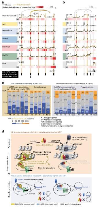 Fig 10. Maternal Pou5f3/Sox3-initiated chromatin remodelling to prime the first transcriptional response to inductive signals during ZGA. a, b Superimposed line tracks show promoter contact frequencies, chromatin accessibilities and DNA occupancies of various chromatin components (Smad2, H3K4me1 and RNAPII) at the Nodal-responsive mesoderm determinants tbxt (a) and eomes (b) between control (uninjected) and mPouV/Sox3 LOF embryos. Heat maps (pâ) below each superimposed line track show the statistical significance (Wald test) of changes caused by mPouV/Sox3 LOF. The footer highlights the occurrences of canonical POU/SOX motifs (black filled rectangles) at accessible pCRMs (±50âbp from the accessibility centre) and one strongly affected pCRM with an arrowhead. Asterisks on the pâ heat map mark significant (FDR â¤10%) reductions to pCRM accessibility. pCRMs are boxed in and their frequency of contacts with the promoter are illustrated with an arc of varying strength. Boxes of affected pCRM and arcs of promoter contacts are coloured orange. c Stacked bar graphs summarise the correlation of unaffected and significantly reduced (FDR â¤10%) pCRM accessibility with RNAPII-mediated expression of all, signal responsive and non-responsive zygotic genes in mPouV/Sox3 LOF embryos at the MBT. These correlations and corresponding numbers (placed on the stacked bars) are shown for pCRM-gene associations and zygotic genes. TSS-centric maps of reduced chromatin accessibility are shown for signal responsive and non-responsive genes in Supplementary Figs. 15â17. d Model of chromatin pioneering and opportunistic engagement to predefine first zygotic responses to inductive signals |
