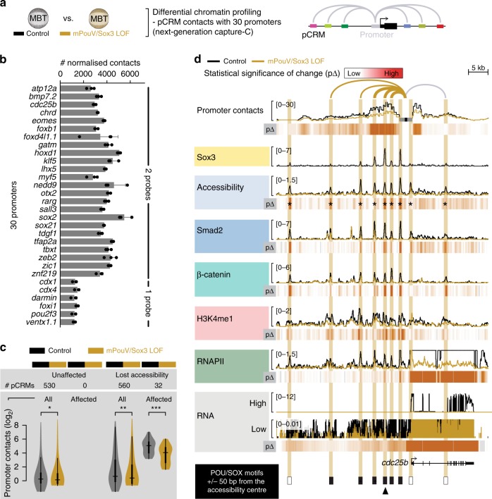 Fig. 9. Pioneering activity of mPouV/Sox3 initiates extensive chromatin remodelling, such as the chromatin looping of distal pCRMs with promoters. a Used approach to reveal the effect of mPouV/Sox3 on chromatin conformation between 30 promoters and distal pCRMs (next-generation capture-C; nâ=â3 biologically independent samples) at the MBT. b Bar graph shows the number of normalised promoter contacts (meanâ+âs.d.; nâ=â3 biologically independent samples) derived from non-redundant capture-reporter FLASH88 reads (Supplementary Fig. 12b) for each promoter captured with one or two probes under control condition (Supplementary Data 10). c Violin plots compare the number of promoter contacts with accessible pCRMs between uninjected and mPouV/Sox3 LOF embryos. The comparison is stratified into pCRMs with stable and lost accessibility upon mPouV/Sox3 LOF and shown for both all and affected (FDR â¤10%) promoter contacts. Wilcoxon tests and effect size estimates: *pâ=â5âÃâ10â5 and reffectâ=â0.12 (small effect); **pâ=â5âÃâ10â30 and reffectâ=â0.34 (medium effect); and ***pâ=â5âÃâ10â10 and reffectâ=â0.78 (large effect). d Superimposed line tracks show promoter contact frequencies, chromatin accessibilities and DNA occupancies of various chromatin components (Smad2, β-catenin, H3K4me1 and RNAPII) at the cdc25b gene locus between control (uninjected) and mPouV/Sox3 LOF embryos. The RNA track is split into a high (0â12) and low (0â0.01) expression window. Note that the low-expression window shows that locally transcribed non-coding super-enhancer RNA depend on mPouV/Sox3 as well as the gene cdc25b. Heat maps (pâ) below each superimposed line plot show the statistical significance (Wald test) of changes caused by mPouV/Sox3 LOF. The footer highlights the occurrences of canonical POU/SOX motifs (black filled rectangles) at accessible pCRMs (±50âbp from the accessibility centre) and one strongly affected pCRM with an arrowhead. Asterisks on the pâ heat map mark significant (FDR â¤10%) reductions to pCRM accessibility. pCRMs are boxed in and their frequency of contacts with the cdc25b promoter are illustrated with an arc of varying strength. Boxes of affected pCRM and arcs of promoter contacts are coloured orange |