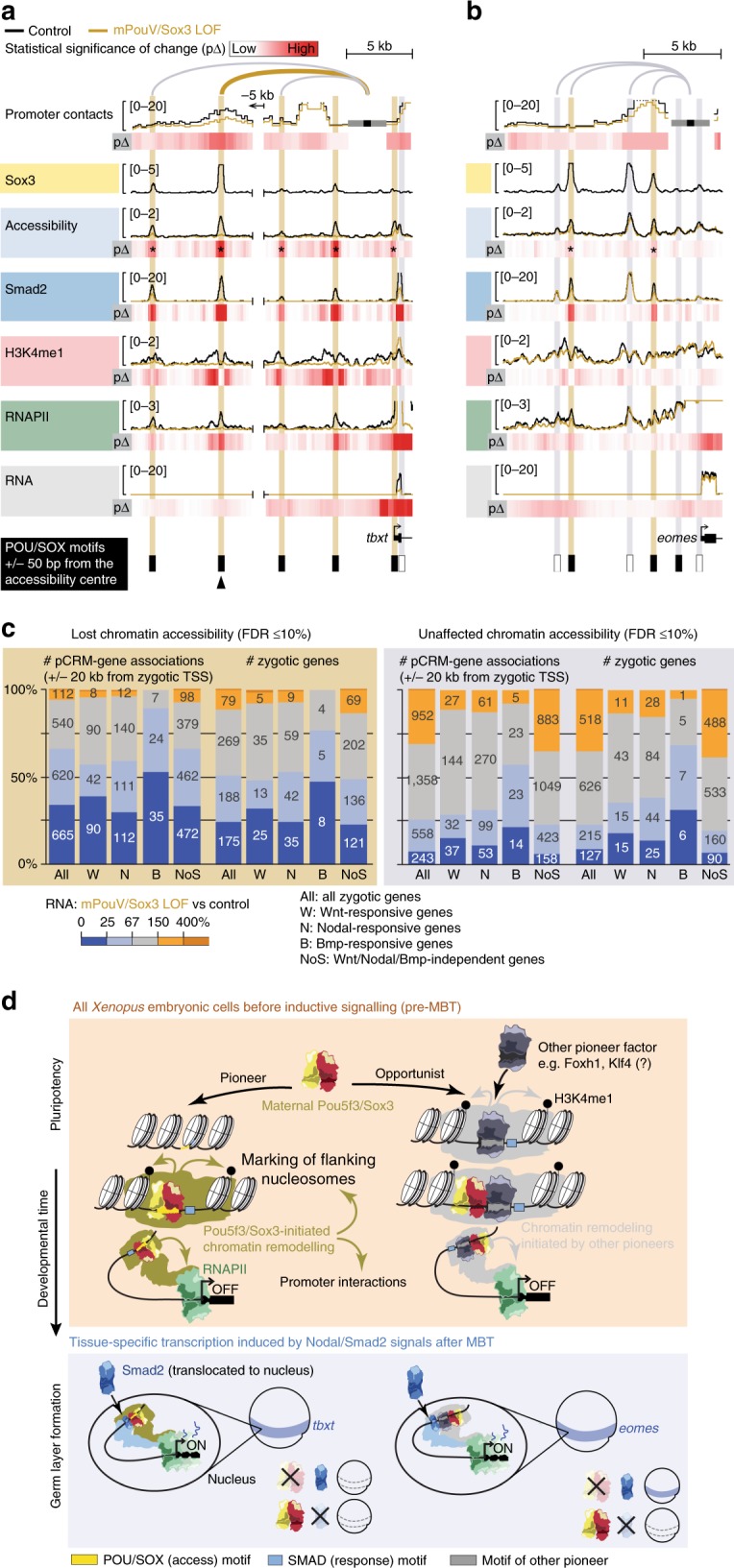 Fig. 10. Maternal Pou5f3/Sox3-initiated chromatin remodelling to prime the first transcriptional response to inductive signals during ZGA. a, b Superimposed line tracks show promoter contact frequencies, chromatin accessibilities and DNA occupancies of various chromatin components (Smad2, H3K4me1 and RNAPII) at the Nodal-responsive mesoderm determinants tbxt (a) and eomes (b) between control (uninjected) and mPouV/Sox3 LOF embryos. Heat maps (pâ) below each superimposed line track show the statistical significance (Wald test) of changes caused by mPouV/Sox3 LOF. The footer highlights the occurrences of canonical POU/SOX motifs (black filled rectangles) at accessible pCRMs (±50âbp from the accessibility centre) and one strongly affected pCRM with an arrowhead. Asterisks on the pâ heat map mark significant (FDR â¤10%) reductions to pCRM accessibility. pCRMs are boxed in and their frequency of contacts with the promoter are illustrated with an arc of varying strength. Boxes of affected pCRM and arcs of promoter contacts are coloured orange. c Stacked bar graphs summarise the correlation of unaffected and significantly reduced (FDR â¤10%) pCRM accessibility with RNAPII-mediated expression of all, signal responsive and non-responsive zygotic genes in mPouV/Sox3 LOF embryos at the MBT. These correlations and corresponding numbers (placed on the stacked bars) are shown for pCRM-gene associations and zygotic genes. TSS-centric maps of reduced chromatin accessibility are shown for signal responsive and non-responsive genes in Supplementary Figs. 15â17. d Model of chromatin pioneering and opportunistic engagement to predefine first zygotic responses to inductive signals |