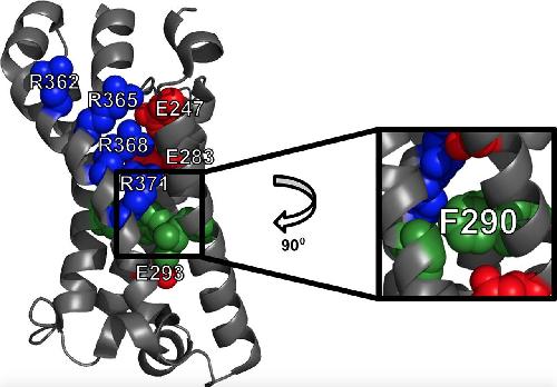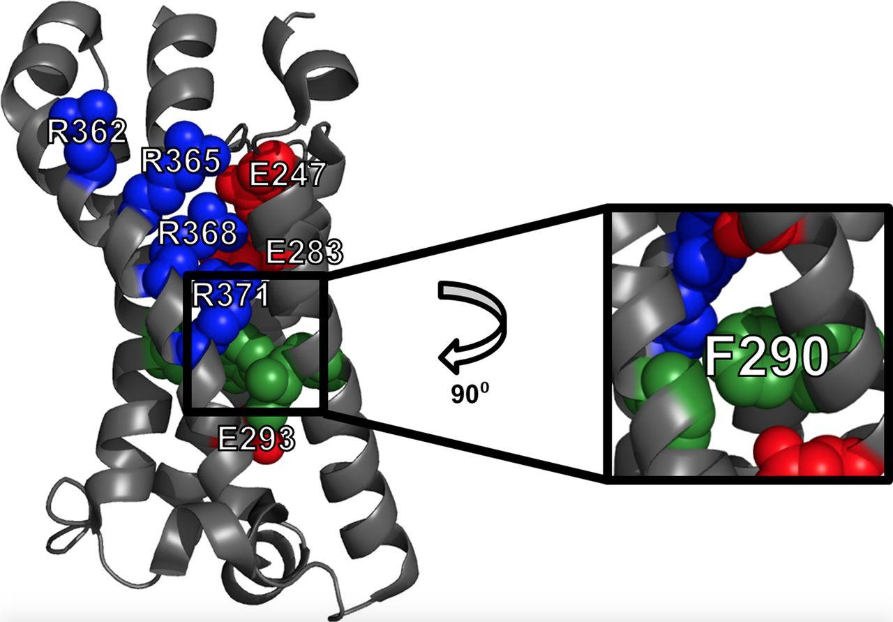 Crystal structure of the Kv 1.2/2.1 chimera suggests electrostatic accommodation of gating charges within the voltage sensing domain. Labels correspond to the residues at homologous positions in Shaker. Voltage-sensing arginine residues are shown in blue, conserved glutamate residues are shown in red, and hydrophobic residues, including the conserved phenylalanine in the hydrophobic plug (F290 in Shaker), are shown in green.