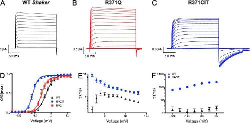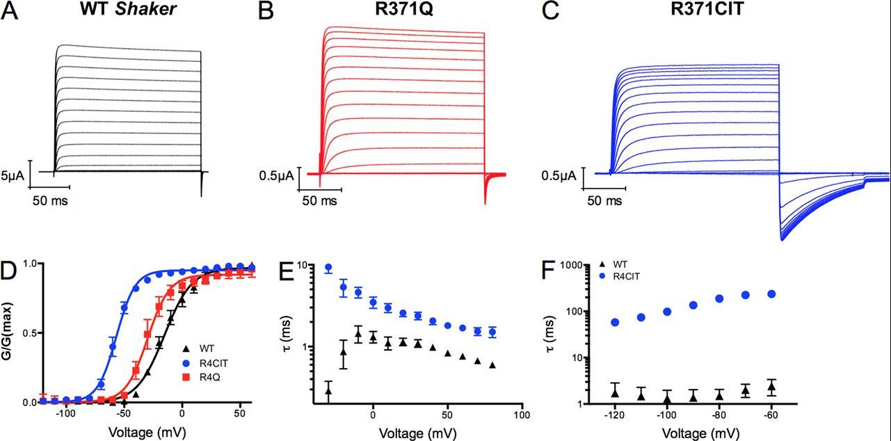 Outsized electrostatic role for R4 in channel deactivation. (A–C) Normalized G-V curves from COVC of WT-, R371Q-, and R371Cit-Shaker. Oocytes were held at −80 mV, then prepulsed to −120 mV for 200 ms, before a variable pulse ranging from 80 mV to −120 mV, followed by a postpulse to −120 mV, before returning to the original holding potential. (D) Normalized G-V values. Error bars represent ±SEM. (E) A comparison of the activation rate (τ) between WT- and R371Cit-Shaker as derived from the same data used for the G-V curves. (F) Deactivation rate for WT- and R317Cit-Shaker. For these data, oocytes were held at −80 mV, prepulsed to −120 mV for 200 ms, then pulsed to 80 mV for 50 ms, followed by a variable pulse ranging from 80 mV to −120 mV for 350 ms, before returning to the original holding potential.