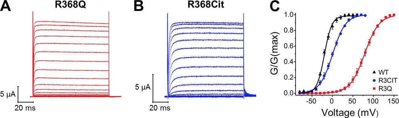 Effects on activation of encoding citrulline at R3 in Shaker. (A and B) Voltage-dependent ionic currents from oocytes expressing R368CIT- and R368Q-Shaker channels. Oocytes were held at −80 mV and subjected to 100-ms pulses in 10-mV steps, followed by 100-ms pulses to −40 mV (Cit) or −30 mV (Q) before returning to the holding potential. (C) Normalized G-V values. Error bars represent ±SEM. Note that the same WT data are used here and in Fig. 3 D. At R3, neutralization via citrulline resulted in a rightward shift and change in activation slope, suggesting that a positive charge at this position is necessary for normal activation. However, the effect on activation is modest compared with mutation to glutamine.