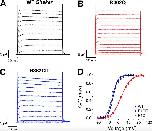 Encoding of citrulline into Shaker. (A) Structural and electrostatic representations of the side chains of arginine, citrulline, and glutamine. (B) Currents generated from co-injection of cRNA encoding R1TAG, R3TAG, and R4TAG with CIT-tRNA compared with those injected with cRNA and full-length (pCA-ligated) tRNA in parallel. Lack of expressed current in the pCA condition for a given position is consistent with faithful encoding of citrulline. Error bars indicate SEM.