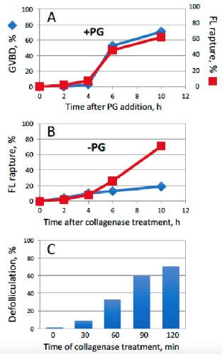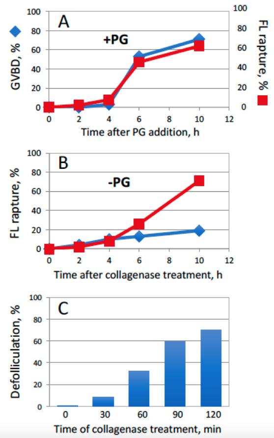 Figure 3. Effects of PG on the follicular oocytes pretreated with collagenase. Isolated follicles were pretreated with 5 mg/mL collagenase for 30 min before PG administration. (A) Time courses of GVBD and follicle rupture in the PG-treated oocytes; (B) time courses of spontaneous hormone-independent defolliculation in the follicles pretreated with collagenase for 30 min (blue color) or 120 min (red color); (C) time dependency of defolliculation in the presence of 5 mg/mL collagenase. The experiment was repeated with five batches of follicular oocytes obtained from different animals, and the results of a single batch experiment are presented.