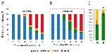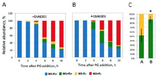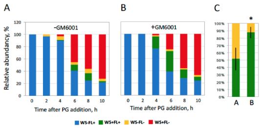 Figure 5. Effect of matrix metalloproteinase (MMP) inhibition on oocyte maturation and defolliculation. (A,B) Ratios of the specific oocyte phenotypes, as designated in the legend to Figure 4, in the follicular culture preincubated for 30 min with 5 mg/mL collagenase and treated with PG in the absence or presence of an MMP inhibitor, respectively. The inhibitor was added to the follicular oocytes at a final concentration of 50 µM at the time of PG administration. (C) Relative frequencies of the two intermediate phenotypes, WS+FL+ and WSâFLâ, under the conditions described for panels (A,B). Bars in panel (C) represent SD values of the mean obtained in four experiments. An asterisk in panel C indicates statistical significance in the phenotype ratio between A and B (p < 0.05).