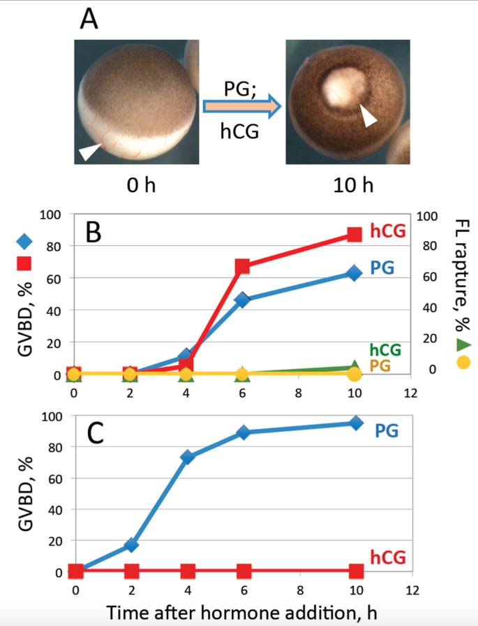 Figure 1. Effects of progesterone (PG) and human chorionic gonadotropin (hCG) on Xenopus follicular oocytes in vitro. (A) Morphology of isolated stage VI follicles before and after hormonal treatment. The white arrowheads in the panel point to the thin blood capillaries visible in the follicle layer. (B) Time course of germinal vesicle breakdown (GVBD) and follicle rupture in the hormone-treated oocytes. (C) Effects of the ovulation hormones on defolliculated oocytes. To remove the follicle layer, oocytes were treated with 5 mg/mL collagenase for 3 h before hormone administration. The experiment was repeated with five batches of follicular oocytes obtained from different animals. The results of a single batch experiment are presented in the figure.