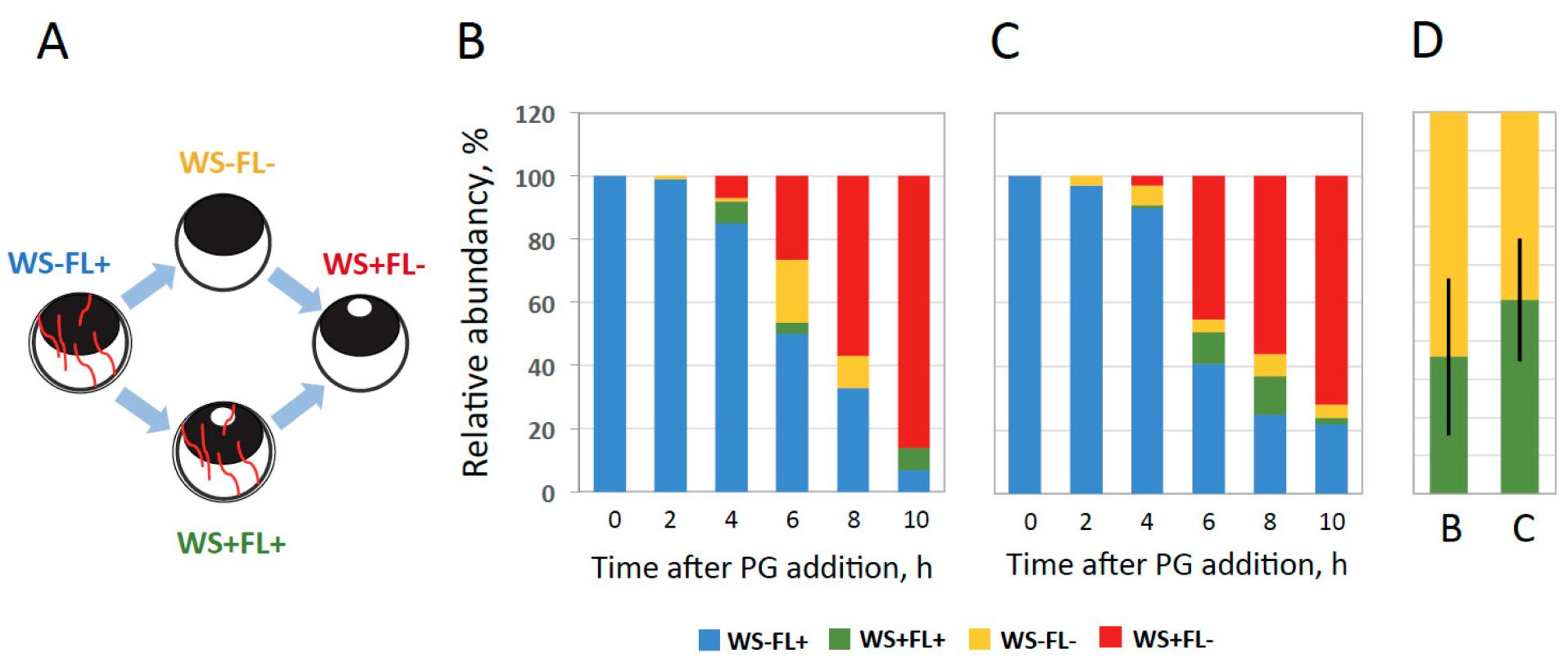 Figure 4. Synchronization of GVBD and follicular rupture during in vitro ovulation. (A) Two possible sequences of events during ovulation. The four distinctive morphological types can be observed during this process: oocytes without a white spot surrounded by follicle cells (WSâFL+), oocytes with a white spot and follicle cells (WS+FL+), oocytes without a white spot and follicle cells (WSâFLâ), and oocytes with a white spot and without follicle cells (WS+FLâ). (B) Ratios of the oocyte phenotypes in the PG-treated follicular culture preincubated for 30 min with 5 mg/mL collagenase; (C) The phenotype ratios in the follicle culture treated with the hormone in the presence of 50 µg/mL of collagenase. (D) Relative frequencies of the two intermediate phenotypes WS+FL+ and WSâFLâ under the conditions described for panels (B,C). The experiment was repeated with five batches of follicular oocytes obtained from different animals, and the results of a single batch experiment are shown in panels (B,C). Bars in panel (D) represent SD values of the mean obtained in five experiments.