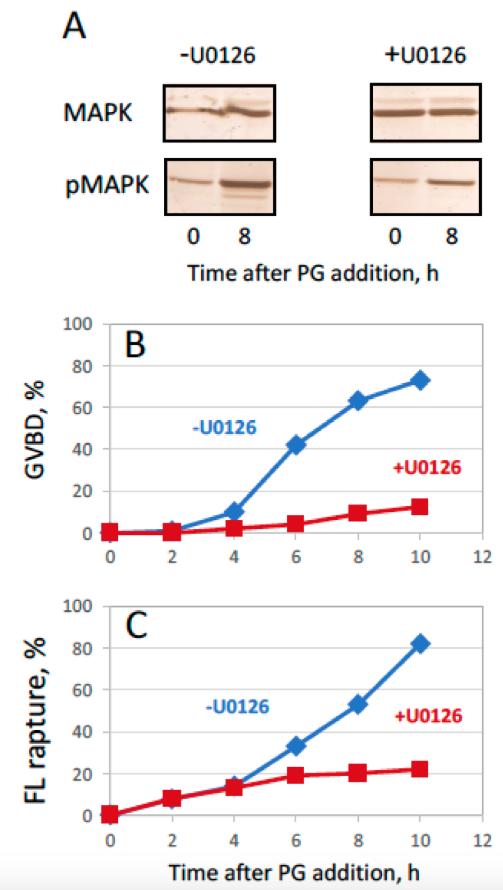 Figure 6. Effect of MAPK pathway inhibition on maturation and defolliculation. (A) Phosphorylation status of MAPK in the absence or presence of an MAPKK inhibitor during in vitro ovulation of Xenopus oocytes. The MAPKK inhibitor U0126 was added to the follicular oocytes at a final concentration of 50 µM at the time of PG administration. (B,C) Time courses of GVBD and follicular rupture, respectively. The experiment was repeated with four batches of follicular oocytes obtained from different animals and the results of a single batch experiment are presented.