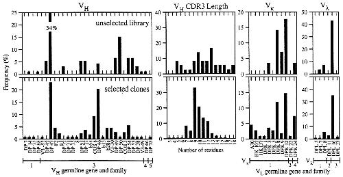 V-gene usage and VH CDR3 length of unselected and antigen-specific scFv. The VH and VL genes were sequenced and the germ-line gene was assigned based on homology to a database (VBASE) of germ-line V-genes compiled by Tomlinson et al. (25). Specific VH, Vκ, and Vλ genes are listed on the ordinate, with the VH, Vκ, or Vλ germ-line gene family indicated below. Only V-genes in unselected or selected clones are listed.