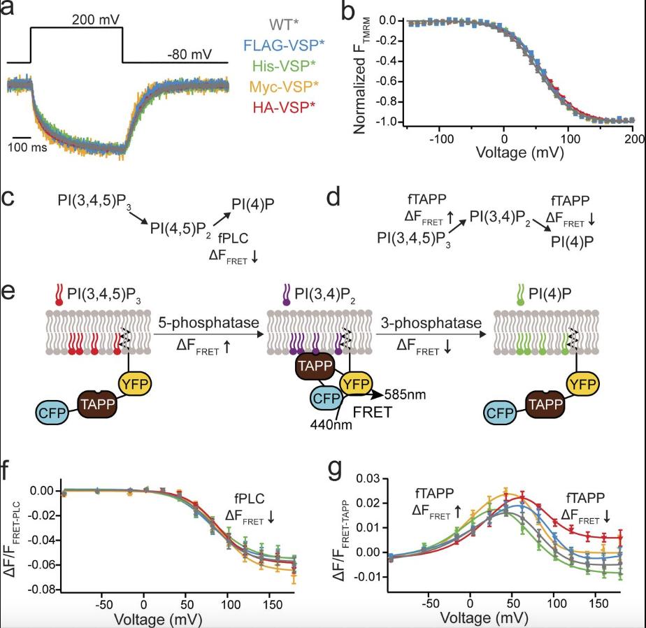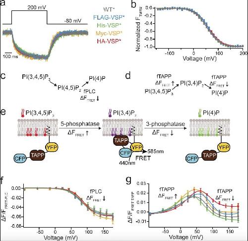 Figure 1. N-terminal tags do not alter Ci-VSP function. (a) Representative TMRM fluorescence traces during a step from a holding potential of â80 to 200 mV for WT*, FLAG-VSP*, His-VSP*, Myc-VSP*, and HA-VSP* (where the * indicates TMRM labeling). Traces are normalized to the maximal fluorescence change. The voltage trace shows the actual voltage recorded during acquisition. (b) Normalized TMRM fluorescence versus voltage relationship. Data fit to single Boltzmann equations. None of the N-terminal tags alter the kinetics or the voltage dependence of the VSD motions, indicating they are not influencing VSP function. n ⥠11. Some errors bars are smaller than the size of the symbols. (c and d) Schematics of the VSP reactions where the fPLC monitors the PI(4,5)P2 reactions and the fTAPP monitors the PI(3,4)P2 reactions. (e) Cartoon representation of fTAPP binding and release with increasing and decreasing PI(3,4)P2 concentrations. The binding of fTAPP to PI(3,4)P2 results in a conformational change that increases the FRET signal. Similarly, a reduction of PI(3,4)P2 results in a decrease in the FRET signal. (f) ÎF/F fPLC FRET ratio versus voltage relationship shows a fluorescence decrease (net 5-phosphatase reaction). n ⥠9. Data fit with a single Boltzmann equation. (g) ÎF/F fTAPP FRET ratio versus voltage relationship with the fluorescence increase (net 5-phosphatase reaction) predominating at lower voltages and the fluorescence decrease (net 3-phosphatase reaction) predominating at higher voltages. n ⥠11. Data fit with a double Boltzmann equation. Error bars are ±SEM. |