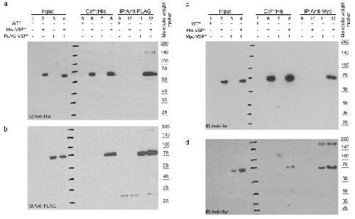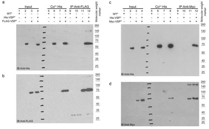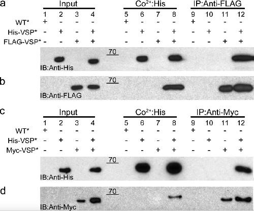 Figure 2. Ci-VSP subunits interact with each other. (a and b) Oocytes expressing WT*, His-VSP*, FLAG-VSP*, or a His-VSP*/FLAG-VSP* mixture were processed and pulled down with Co2+ beads or coimmunoprecipitated with anti-FLAG beads. Subsequent Western blots were stained with anti-His (a) and anti-FLAG (b). The His blot shows His-VSP* coimmunoprecipitated from the His/FLAG mixture using anti-FLAG beads (lane 12), whereas the FLAG blot shows FLAG-VSP* pulled down from the His/FLAG mixture using Co2+ beads (lane 8). (c and d) Oocytes expressing WT*, His-VSP*, Myc-VSP*, or a His-VSP*/Myc-VSP* mixture were processed and pulled down with Co2+ beads or coimmunoprecipitated with anti-Myc beads. Western blots were stained with anti-His (c) and anti-Myc (d). The His blot shows His-VSP* coimmunoprecipitated from the His/Myc mixture using anti-Myc beads (lane 12), whereas the Myc blot shows Myc-VSP* pulled down from the His/Myc mixture using Co2+ beads (lane 8). These pull-downs indicate that the individual Ci-VSP subunits interact with each and form multimers on the membrane. Blots are representative of n = 4 experiments. Raw data for the Western blots are shown in Fig. S2. IB, immunoblotting; IP, immunoprecipitation. |