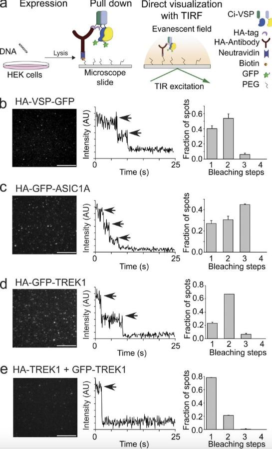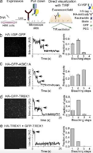 Figure 3. Ci-VSP forms dimers. (a) Schematic of the SiMPull subunit counting assay depicting the HA-VSP-GFP expression in HEK293 cells followed by pull down of the HA tag with anti-HA on coverslips and recording of the GFP fluorescence using TIRF. TIR, total internal reflection. (b) Left: TIRF images of HA-VSP-GFP single molecules. Middle: Representative trace showing two-step photobleaching of HA-VSP-GFP. AU, arbitrary units. Right: Summary of photobleaching step distribution for HA-VSP-GFP. Two-step bleaching events indicate VSP forms dimers on the membrane. (c) SiMPull data for trimer control, HA-GFP-ASIC1A. Left: TIRF images. Middle: Representative trace showing three-step photobleaching. Right: Summary of photobleaching step distribution. (d) SiMPull data for dimer control, HA-GFP-TREK1. Left: TIRF images. Middle: Representative trace showing two-step photobleaching. Right: Summary of photobleaching step distribution. (e) SiMPull data for monomer control, HA-TREK1 pull down of TREK1-GFP. Left: TIRF images. Middle: Representative trace showing single-step photobleaching. Right: Summary of photobleaching step distribution. Error bars are ±SEM. Bars, 2 μm. |