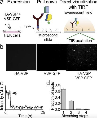 Figure 4. Ci-VSP subunits pull each other down consistent with a dimer complex. (a) Schematic of the SiMPull assay where HA-VSP is coexpressed with VSP-GFP in HEK293 cells followed by pull down of the HA-VSP with anti-HA on coverslips. Any HA-VSP dimers will not be visible, and VSP-GFP dimers do not interact and are washed away, leaving the HA-VSP with VSP-GFP dimer as the only visible fluorescent spot using TIRF. TIR, total internal reflection. (b) SiMPull TIRF images of the HA-VSP alone (left), VSP-GFP alone (middle), and HA-VSP/VSP-GFP mixture (right). Fluorescent spots are only visible in the HA-VSP/VSP-GFP sample. Bars, 2 μm. (c) Representative trace showing single-step photobleaching of the HA-VSP/VSP-GFP spots in b. AU, arbitrary units. (d) Summary of the photobleaching step distribution of the HA-VSP/VSP-GFP spots in b. As expected, monomers predominate the mixture, indicating that a HA-VSP subunit pulls down a VSP-GFP subunit, forming a dimer complex. Error bars are ±SEM. |