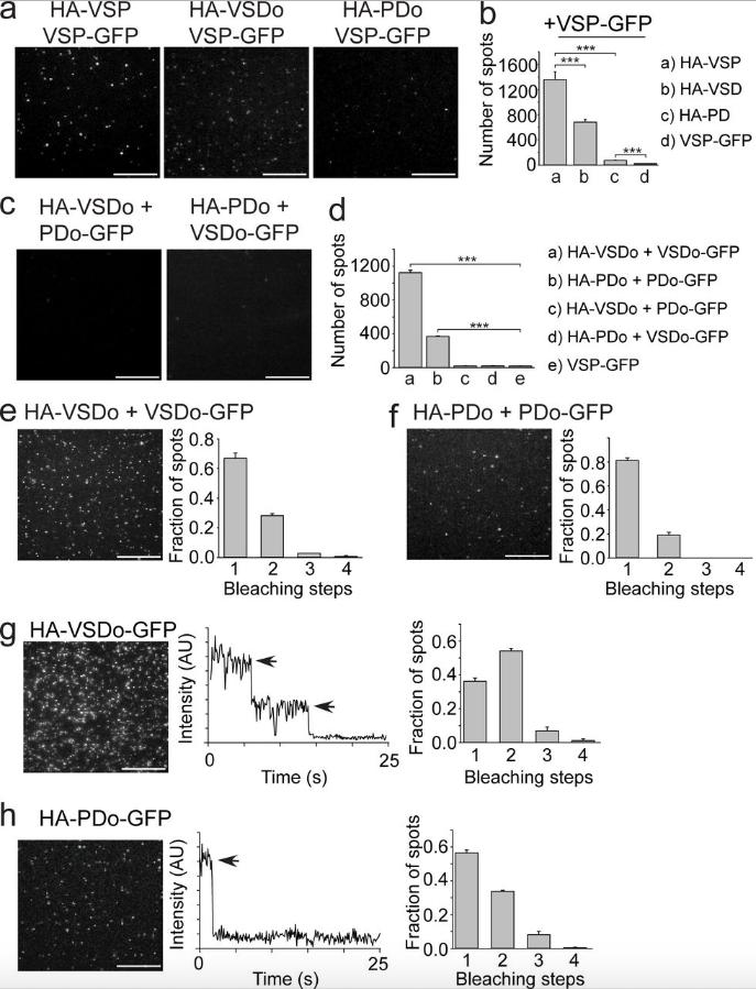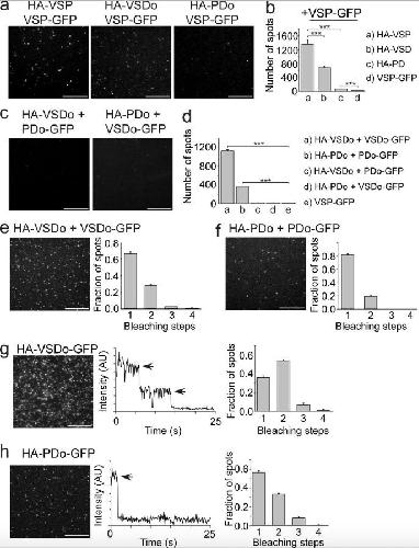 Figure 5. Ci-VSP dimerization mediated mainly by VSD. (a) TIRF images of a VSP-GFP pull-down using either HA-VSP (full length, left, reused from Fig. 4 b, right), HA-VSDo (middle), or HA-PDo (right). (b) Summary of the number of single-molecule spots for each pull-down condition. The HA-VSDo was able to pull down almost half of the number of VSP-GFPs compared with full-length HA-VSP. VSP-GFP pull down with HA-PDo was significantly higher than pull down with VSP-GFP alone. Studentâs t tests, ***, P < 0.001. (c) TIRF images of HA-VSDo pull-down of PDo-GFP (left) and HA-PDo pull-down of VSDo-GFP (right). No spots were detected in either experiment as expected. (d) Summary of the number of single-molecule spots for each pull-down condition shown in c, e, and f. Studentâs t tests, ***, P < 0.001. (e) HA-VSDo pull-down of VSDo-GFP. TIRF single-molecule image is shown on the left, and a summary of the photobleaching step distribution is shown on the right. Spots bleached in mostly single steps, indicating that a VSD is able to pull down another. (f) HA-PDo pull-down of PDo-GFP. TIRF single-molecule image is shown on the left, and a summary of the photobleaching step distribution is shown on the right. Spots bleached in mostly single steps, indicating that a PD is able to pull down another. (g) SiMPull data for HA-VSDo-GFP. Left: TIRF image of single molecules. Middle: Representative trace showing two-step photobleaching. Right: Summary of photobleaching step distribution. Two-step bleaching events indicate VSDâVSDs form dimers on the membrane. (h) SiMPull data for HA-PDo-GFP. Left: TIRF image of single molecules. Middle: Representative trace showing single-step photobleaching. Right: Summary of photobleaching step distribution. PDâPD dimers are weaker than the VSDâVSD dimers. Error bars are ±SEM. Bars, 2 μm. |