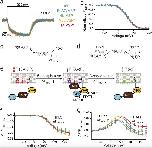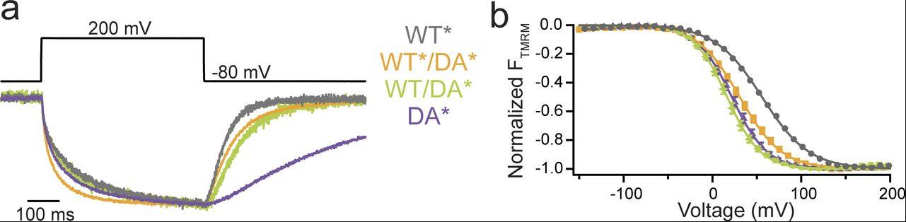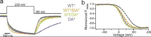 Figure 6. Ci-VSP VSD motions influence each other across the multimer complex. (a) Representative TMRM fluorescence traces during a step from a holding potential of −80 to 200 mV for WT* (G214C), DA* (G214C D331A), WT*/DA*, and WT/DA*. Traces are normalized to the maximal fluorescence change. The deactivation kinetics of the mixtures more closely resemble the WT* alone than the DA* alone, indicating that the WT* VSD influences the VSD kinetics from the DA* subunit. (b) Normalized TMRM fluorescence versus voltage relationship. Data fit to single Boltzmann equations. The voltage dependence of the mixtures more closely resembles the DA* alone than the WT* alone, suggesting that the DA* VSD more strongly influences the VSD voltage dependence. Error bars represent ±SEM; n ≥ 12. Some errors bars are smaller than the size of the symbols. |