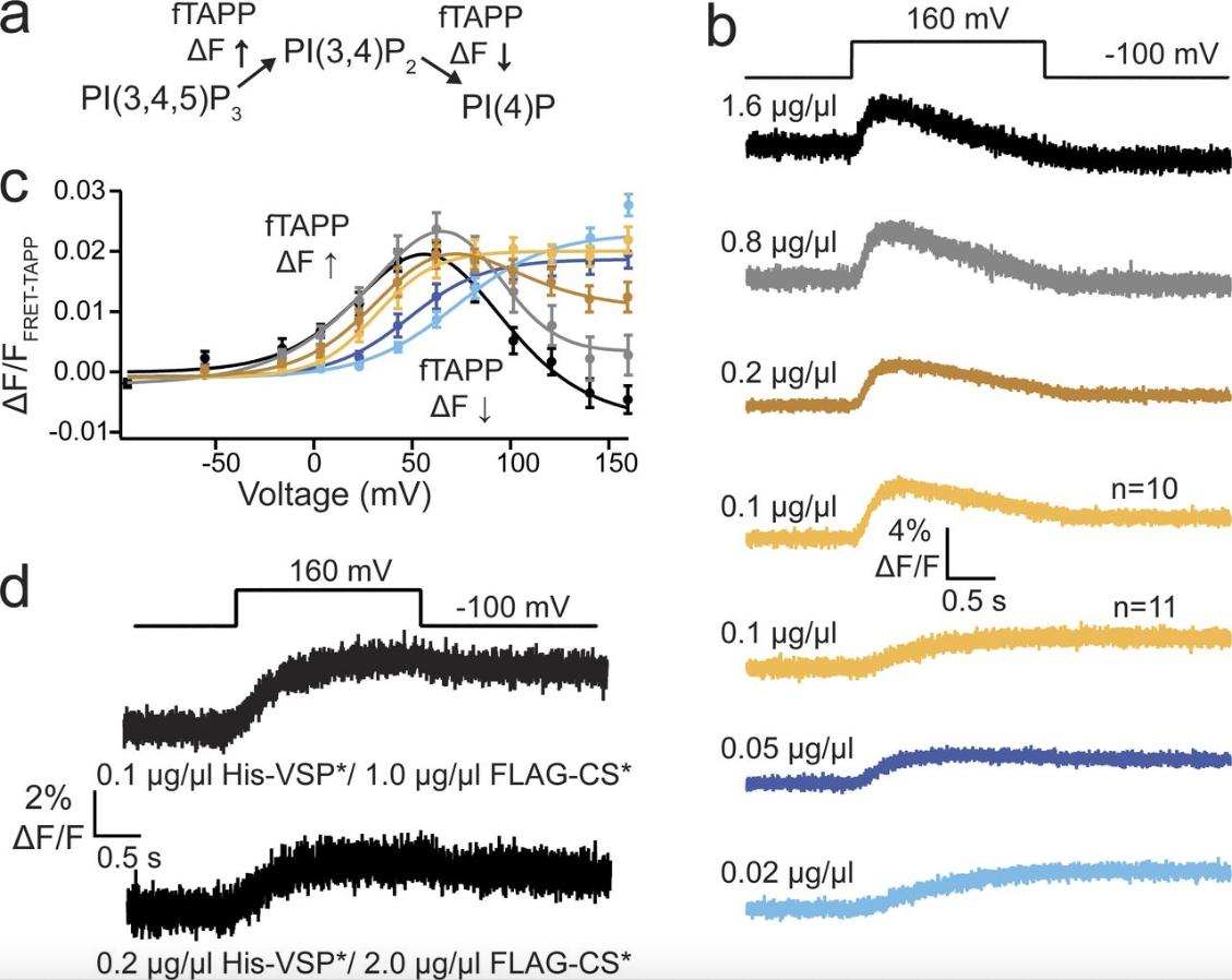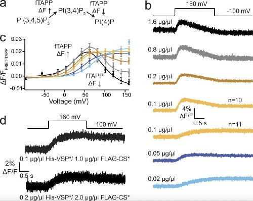 Figure 7. Ci-VSP dimerization responsible for 3-phosphatase activity. (a) Schematic of fTAPP assay where the fTAPP FRET sensor increases FRET when PI(3,4)P2 is produced and decreases FRET when PI(3,4)P2 is depleted. (b) Averaged fTAPP FRET traces over time during a voltage step from a holding potential of −100 to 160 mV for fTAPP coexpressed with varying amounts of His-VSP cRNA: 1.6, 0.8, 0.2, 0.1, 0.05, and 0.02 µg/µl. Higher His-VSP* concentrations display both 5- and 3-phosphatase activity, whereas the lower concentrations only show 5-phosphatase activity. The 0.1 µg/µl samples were evenly split with half the cells showing both activities and half the cells showing only one. n ≥ 11. (c) ΔF/F fTAPP FRET ratio versus voltage relationships for all six cRNA concentrations. As the concentration of His-VSP* decreases, the voltage dependence of the FRET increase shifts to higher voltages whereas the FRET signal decrease disappears. Error bars represent ±SEM; n ≥ 11. Data fit with a double or single Boltzmann equation. (d) Averaged fTAPP FRET traces over time for fTAPP coexpressed with 1:10 mixtures of active and inactive VSP: 0.1:1.0 µg/µl, His-VSP*:FLAG-CS* and 0.2:2.0 µg/µl, His-VSP*:FLAG-CS*. In both cases, only a FRET increase is observed, even though the 0.2 µg/µl concentration alone in b always show both an increase and a decrease, and the 0.1 µg/µl concentration alone in b was evenly split. n ≥ 10. |