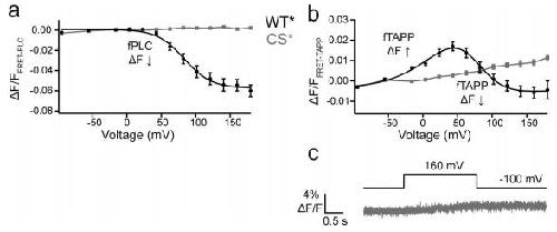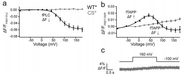 Figure S1. Catalytically inactive Ci-VSP does not alter PIP concentrations in oocytes. (a) ΔF/F fPLC FRET ratio versus voltage for WT* and catalytically inactive C363S (CS*) Ci-VSP. WT* shows a fluorescence decrease (net 5-phosphatase reaction), whereas CS* does not. Error bars are ±SEM; n = 16. WT* data fit with a single Boltzmann equation. (b) ΔF/F fTAPP FRET ratio versus voltage for WT* and CS*. WT* shows a fluorescence increase (net 5-phosphatase reaction) predominating at lower voltages and the fluorescence decrease (net 3-phosphatase reaction) predominating at higher voltages. CS* shows a small increase in fluorescence at higher voltages indicative of the endogenous VSP found in X. laevis oocytes. Error bars are ±SEM; n ≥ 20. WT* data fit with a double Boltzmann equation. (c) Averaged fTAPP FRET trace over time during a voltage step from a holding potential of −100 to 160 mV for fTAPP coexpressed with CS*. Endogenous VSP causes a small and very slow increase in FRET over time. n = 11. |