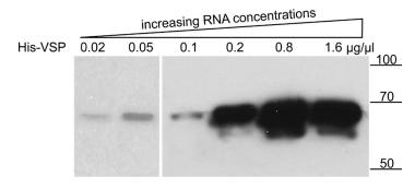 Figure S3. Increasing cRNA concentrations lead to increasing protein expression. Individual oocytes were injected with concentrations of His-VSP cRNA ranging from 0.02 to 1.6 µg/µl. Each cell lysate was probed for protein expression by Western blot. The higher concentrations of cRNA led to higher protein expression. |