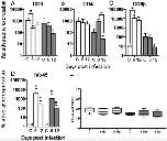 Figure 7. Relative expression of T cellârelated immune genes in the liver of M. marinumâinoculated adults and tadpoles. Four-month-old young adults (white bar) and 3-wk-old tadpoles (gray bar) were i.p. inoculated with 1 à 106 or 3 à 105 CFU of M. marinum, respectively (n = 5â6 per time point). Relative gene expression in liver for (A) CD3ε, (B) CD8β, (C) CD4, and (D) iVα45-Jα1.14 was normalized to the housekeeping gene gapdh. (E) Ct values for gapdh of each time point between adults and tadpoles. Asterisks indicate a significant difference by the KruskalâWallis test (p < 0.05). C, uninfected control; u.d, undetected value.