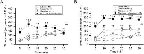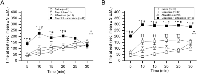 Figure 1. Effects of combining alfaxalone with propofol, or with diazepam on mouse behavior. (A) A 30-min activity test was conducted immediately following i.p. injections of normal saline (20 Units), propofol (50 mg/kg), alfaxalone (30 mg/kg), or the combination of propofol (50 mg/kg) + alfaxalone (30 mg/kg), to determine drug effects on time at rest (absence of movement) as a function of post-injection time (5-min blocks) across the test session (means ± S.E.M.; n = 11–12 mice per treatment group). A repeated measures (rm) ANOVA revealed a significant drug effect (**p = 0.0005) and drug × time interaction (***p < 0.00005), with the propofol + alfaxalone mice exhibiting significantly increased time at rest compared to the single drug/saline control groups on average across the test session. Significant between-groups comparisons are shown for these contrasts: saline vs. propofol + alfaxalone at 5, 10, 15 (*p < 0.003), and 20 (*p = 0.031) min post-injection; alfaxalone vs. propofol + alfaxalone at 5, 10 (†p < 0.002), and 20 (†p = 0.038) min; and propofol vs. propofol + alfaxalone at 5, 10 (#p < 0.0002), and 15 and 20 (#p < 0.040) min. No significant differences were observed for the contrasts involving the saline vs. propofol or saline vs. alfaxalone groups. (B) A separate study was conducted on an independent cohort of naïve mice to examine the potential sedating drug effects following i.p. injections of normal saline (20 Units), diazepam (4 mg/kg), alfaxalone (30 mg/kg), or the combination of diazepam (4 mg/kg) + alfaxalone (30 mg/kg) on time at rest (n = 10 for each group). An rmANOVA yielded a significant drug effect (**p < 0.00005) and drug × time interaction (***p = 0.0004), with the diazepam + alfaxalone treated mice having significantly greater times at rest compared to the saline, alfaxalone, and diazepam groups on average across the session. Between-groups comparisons conducted within these contrasts showed robust differences between each of the single drug/saline control groups relative to the diazepam + alfaxalone treated mice for every post-injection time (5–30 min) interval (p < 0.0002; for the comparisons involving saline (*), alfaxalone (†), or diazepam (#), respectively). The diazepam group also had significantly increased rest times relative to the saline control mice, with pair-wise comparisons revealing significant differences at 10, 15, 20, and 25-min post-injection (††p < 0.003).