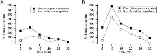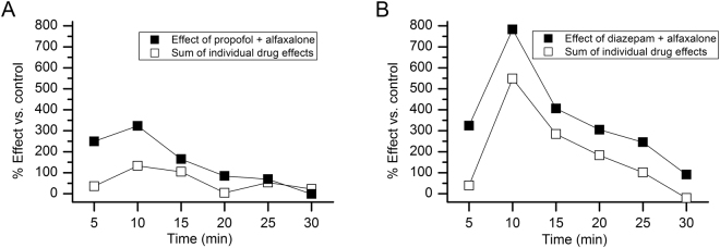 Figure 2. Comparison of the behavioral effects of from the co-administration of drugs with the sum of effects of individual drugs. (A) The graph compares the performance levels induced by the co-administration of propofol + alfaxalone to that resulting from the mathematical sums of the single drug applications. The magnitude of change in the mean percent times at rest above baseline for the co-administration of the drugs was greater early on in the test session, being approximately 7 times higher during the first time interval compared to that derived from adding together the percentages of the single applications of propofol and alfaxalone. These differences declined over the session such that the percentages from the two conditions were roughly equivalent by the end of the test session. (B) The graph compares the performance levels induced by the co-administration of diazepam + alfaxalone to that resulting from the mathematical sums of the single drug applications. The percent time at rest above baseline was consistently higher throughout the test session in the co-administered group compared to the percent change observed in the summed, single drug applications. The degree of change in the percent times at rest above baseline ranged from being 8.3 to 1.4 times higher in the co-administered drug group.