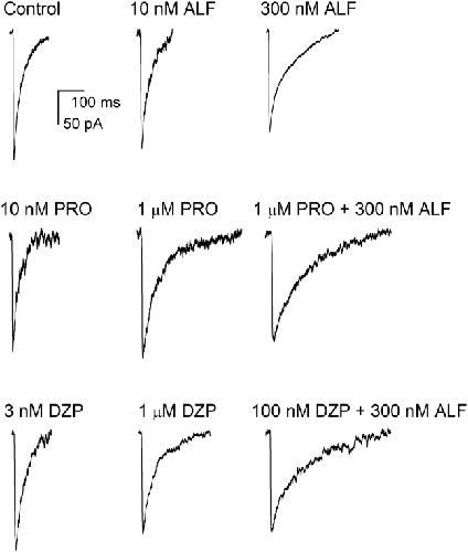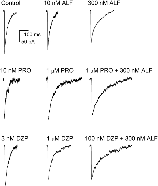Figure 3. Effects of alfaxalone, propofol and diazepam on synaptic currents. Sample averaged sIPSCs recorded under control conditions, or in the presence of 10 nM alfaxalone (ALF), 300 nM alfaxalone, 10 nM propofol (PRO), 1 μM propofol, 3 nM diazepam (DZP), 1 μM diazepam, or the combinations of propofol + alfaxalone or diazepam + alfaxalone. The drugs were added to the bath at least 10 min before recordings. All traces are from separate cells.