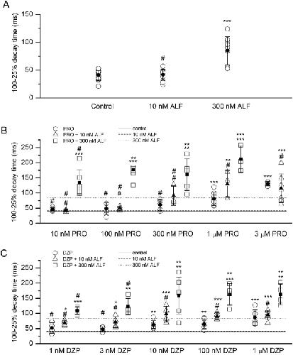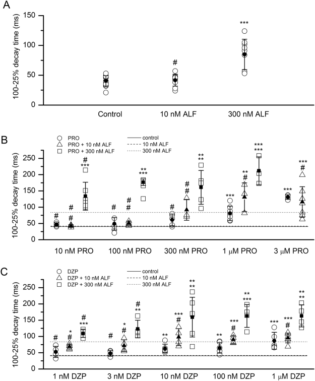 Figure 4. Summary of the effects of alfaxalone, propofol and diazepam on synaptic currents. (A) Summary of the decay time courses of sIPSCs recorded under control conditions or in the presence of 10 nM or 300 nM alfaxalone. The graph shows data from each cell tested (open circles) and mean ± S.D. for the experimental condition (filled circles and error bars). (B) Summary of the decay time courses of sIPSCs recorded in the presence of propofol with or without alfaxalone. The open symbols show data from each cell tested, and the filled symbols and error bars show mean ± S.D. Due to saturation at lower propofol concentrations, 3 μM propofol was not tested in the presence of 300 nM alfaxalone. Statistical analysis was done by comparing the decay times for 10 nM-3 μM propofol to control, using ANOVA with Dunnett’s correction. For combinations of propofol and alfaxalone, the top symbol applies to comparison of propofol + alfaxalone with alfaxalone alone. The bottom symbol applies to comparison of propofol + alfaxalone with propofol alone. (C) Summary of the decay time courses of sIPSCs recorded in the presence of diazepam with or without alfaxalone. The open symbols show data from each cell tested, and the filled symbols and error bars show mean ± S.D. Statistical analysis was done by comparing the decay times for 1 nM-1 μM diazepam to control. For combinations of diazepam and alfaxalone and, the top symbol applies to comparison of diazepam + alfaxalone with alfaxalone alone. The bottom symbol applies to comparison of diazepam + alfaxalone with diazepam alone. In (B) and (C), the solid line shows the decay time under control conditions (no modulators). The dashed line shows the decay time in the presence of 10 nM alfaxalone. The dotted line shows the decay time in the presence of 300 nM alfaxalone. The number of cells was 3–17 for control, drug, or drug combinations. #not significant; *p < 0.05; **p < 0.01; ***p < 0.001.