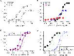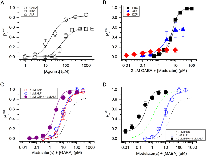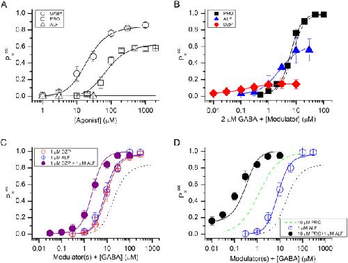 Figure 5. Activation and modulation of concatemeric α1β2γ2L GABAA receptors. (A) Direct activation of the receptor by GABA, propofol (PRO), or alfaxalone (ALF). The ordinate shows the estimated open probability (Po). The curves for GABA and propofol were generated by fitting Equation (1) to experimental data. Direct activation by alfaxalone produced very small currents (<100ânA at 30âμM). The predicted activation curve for alfaxalone was generated using KALF and cALF values determined in (B). (B) Potentiation of GABA-activated receptors by propofol, alfaxalone, or diazepam (DZP). The solid curves were generated by fitting Equation (1) to the data. L was held at (1âââPo,2 μM GABA)/Po,2 μM GABA. The dashed line shows the predicted propofol-potentiation curve using KPRO and cPRO values from (A). (C) Activation by GABA in the presence of 1âμM diazepam, 1âμM alfaxalone or the combination of diazepamâ+âalfaxalone. The curves for single modulators were generated by fitting Equation (1) to the data. L was held at at (1âââPo,1 μM ALF)/Po,1 μM ALF or at (1âââPo,1 μM DZP)/Po,1 μM DZPâ. The open probability for receptors activated by 1âμM alfaxalone or 1âμM diazepam was calculated from the KALF and cALF, or KDZP and cDZP values estimated in (B). The simulated curve for the combination of diazepamâ+âalfaxalone was calculated using Equation (1) and the KGABA and cGABA values from (A), and KALF, cALF, KDZP and cDZP values from (B). (D) Activation by GABA in the presence of 10âμM propofol, 1âμM alfaxalone or the combination of propofolâ+âalfaxalone. The curve for propofol (green dashed line) is based on data from a previous report45. The data for alfaxalone are reproduced from panel C. The simulated curve for the combination of propofolâ+âalfaxalone was calculated using Equation (1) and the KGABA, cGABA, KPRO and cPRO values from (A), and KALF and cALF values from (B). In (C) and (D), the black dotted lines show the GABA concentration-response relationship in the absence of modulators (from A). In all panels the data points show meanâ±âS.D. from at least five cells.