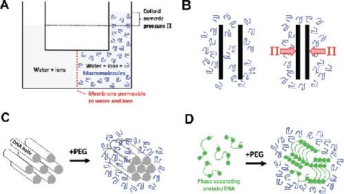 FIGURE 1:. Colloid osmotic pressure (Î ) and depletion forces. (A) Discovery of colloid osmotic pressure. The diagram conceptually illustrates Starlingâs colloid osmometer, where the membrane was a stretched piece of peritoneal membrane and the macromolecule solution was blood plasma (Starling, 1896). The effective pore size depends on the diameter of the holes in the membrane, which permit free exchange of water and ions but not proteins. (B) Illustration of Asakura and Oosawaâs depletion force theory (Asakura and Oosawa, 1954). Two plates are immersed in a solution of macromolecule. When the plates approach closer than the hydrodynamic radius of the macromolecule, it is depleted (or excluded). Because there is now pure solvent (plus ions) between the plates, the solution outside the depleted region exerts a force per unit area which is given by the colloid osmotic pressure Î . The effective pore size is the distance between the plates when the depletion force starts to act. Depletion forces are related to âexcluded volume effects,â although conceptually different formalisms are used to describe them (Rivas and Minton, 2018). (C) Compression of aligned DNA helices by PEG, as measured by x-ray diffraction (Podgornik et al., 1995). This is a practical implementation of Asakura and Oosawaâs theory. The effective pore size depends on the spaces in the lattice. (D) Phase separation of a disordered protein or RNA promoted by a crowding agent. The circles represent sites of weak, cohesive bonding. The effective pore size depends on the gaps between the macromolecules in the condensed phase. Note that phase separation involves demixing as well as compression, and the physics of the two processes are distinct (see the text).