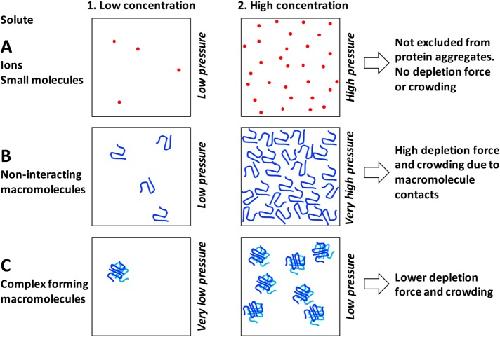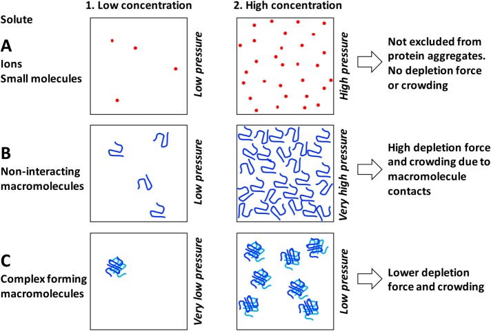 FIGURE 2:. Effect of solute size and complex formation on osmotic and crowding activities. (A) Ions and small molecules exert osmotic pressure proportional to their concentration according to the van’t Hoff equation in both dilute and concentrated regimes. They no not exert depletion forces or crowding activity because they are smaller than the effective pore size of protein and nucleic acid aggregates. (B) Macromolecules exert colloid osmotic pressure according to the linear van’t Hoff equation in the dilute regime (B1). However, they become crowded at fairly low concentration due to their large size (B2). Once crowded, osmotic pressure begins to increase as a second or third power of concentration due to contact between molecules. Unstructured polymers like PEG or intrinsically disordered proteins become crowded at lower concentrations than globular proteins because of their less compact architecture. (C) Complex formation decreases osmotic and crowding activities of macromolecules and may account for a relatively low colloid osmotic pressures inside cells. The boxes contain as many monomers as in B but packaged into tetramers.