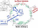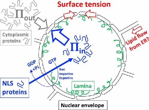 FIGURE 4:. Osmotic model for nuclear morphology. The nuclear envelope (black lines) is a double lipid bilayer perforated by nuclear pores whose outer membrane is contiguous with the endoplasmic reticulum (ER). NLS protein are imported though nuclear pores (gaps) by an energy-coupled, facilitated diffusion process based on Ran, importins, and exportins (also called karyopherins) (blue arrows and text) (Schmidt and Görlich, 2016). We hypothesize the spherical shape is generated by a higher colloid osmotic pressure inside vs. outside (Πin > Πout) opposed by a surface tension (red arrows). Cytoplasmic crowding contributes to Πout and nuclear crowding to Πin. Surface tension is distributed between the lipid bilayers of the nuclear envelope and the nuclear lamina (green), which is a dynamic network of intermediate filaments. Membrane connections between the nuclear envelope and the ER allow lipid flow, which may regulate tension and allow nuclear growth (red arrow). Inflation of the nucleus by Πin is an example of colloid osmotic pressure performing mechanical work inside the cell. This model was inspired by observations in Xenopus egg extract. Similar models have been proposed to account for the response of tissue culture cell nuclei to osmotic and mechanical perturbations (Finan and Guilak, 2010; Kim et al., 2016).