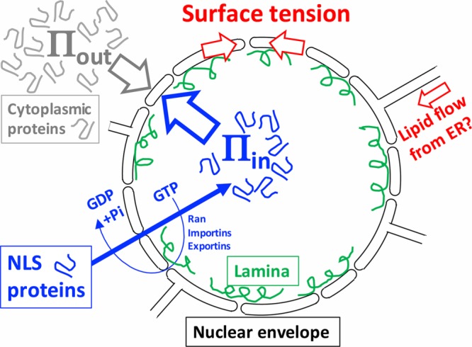 FIGURE 4:. Osmotic model for nuclear morphology. The nuclear envelope (black lines) is a double lipid bilayer perforated by nuclear pores whose outer membrane is contiguous with the endoplasmic reticulum (ER). NLS protein are imported though nuclear pores (gaps) by an energy-coupled, facilitated diffusion process based on Ran, importins, and exportins (also called karyopherins) (blue arrows and text) (Schmidt and Görlich, 2016). We hypothesize the spherical shape is generated by a higher colloid osmotic pressure inside vs. outside (Πin > Πout) opposed by a surface tension (red arrows). Cytoplasmic crowding contributes to Πout and nuclear crowding to Πin. Surface tension is distributed between the lipid bilayers of the nuclear envelope and the nuclear lamina (green), which is a dynamic network of intermediate filaments. Membrane connections between the nuclear envelope and the ER allow lipid flow, which may regulate tension and allow nuclear growth (red arrow). Inflation of the nucleus by Πin is an example of colloid osmotic pressure performing mechanical work inside the cell. This model was inspired by observations in Xenopus egg extract. Similar models have been proposed to account for the response of tissue culture cell nuclei to osmotic and mechanical perturbations (Finan and Guilak, 2010; Kim et al., 2016).