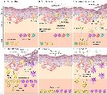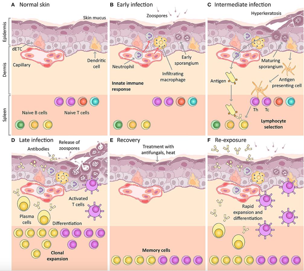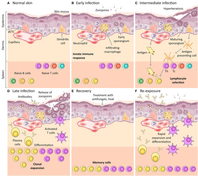 Figure 1. Amphibian host immunity schematic, depicting a histological section through the skin and progressive infection stages with Bd. The inference of the main cellular components is based on mammalian immunology and an expected ânormalâ immune response (including the expected response to vaccination). (A) Normal skin: Layers of uninfected frog skin epidermis including, from deepest to most superficial, the basal lamina, stratum germinativum, stratum spinosum, stratum granulosum, stratum corneum and the superficial mucus layer. Two immune surveillance cells are illustrated within the epidermis, an immune dendritic cell (homologous to Langerhans cell), and a dendritic epidermal T cell (dETC). Within the dermis is a capillary with the nucleated red blood cells of amphibians. An example complement of naïve B and T lymphocytes are depicted waiting quiescent in the spleen, illustrated schematically as the lower band on the figure (please note that the spleen is a separate organ and does not lie adjacent to the dermis in living amphibians). (B) Early infection: Expected immune mechanisms upon initial exposure to Bd, assuming constitutive defenses (such as AMPs and bacteria) are insufficient. Zoospores are illustrated penetrating the mucus layer, and early thalli with zoosporangia developing are illustrated inside deeper host cells. In a normal immune response, pathogen recognition should lead to the infiltration of innate immune cells, illustrated here to include macrophages and granulocytes (such as neutrophils). (C) Intermediate infection: Expected response at an intermediate stage of infection includes the recognition of antigens by dendritic cells that then differentiate into antigen presenting cells and migrate to the spleen enabling antigen-specific selection of lymphocytes. Simultaneously, membrane-bound immunoglobulin on naïve B lymphocytes is exposed to extracellular Bd antigens (transported via the blood circulatory and lymphatic systems). With the assistance of T helper cells, these B cells are activated to respond to infection. (D) Late infection: The late adaptive response involves lymphocyte clonal expansion, differentiation into plasma cells and activated T cells (including cytotoxic and helper T cells), as well as the production of antibodies by plasma cells. (E) Recovery: If the frog is cleared of infection (perhaps by topical antifungals or heat), the skin might be expected to return to normal, however, a cohort of selected memory lymphocytes should remain. (F) Re-exposure: If the frog is then later re-exposed to Bd, the memory lymphocytes (produced during the previous clonal expansion) are then activated and induced to replicate and differentiate, leading to a much more rapid and effective adaptive immune response on re-exposure. This is the concept of immunization (vaccination). |