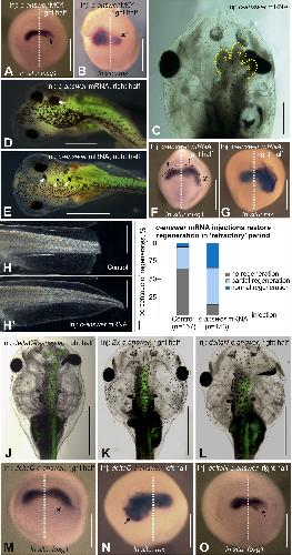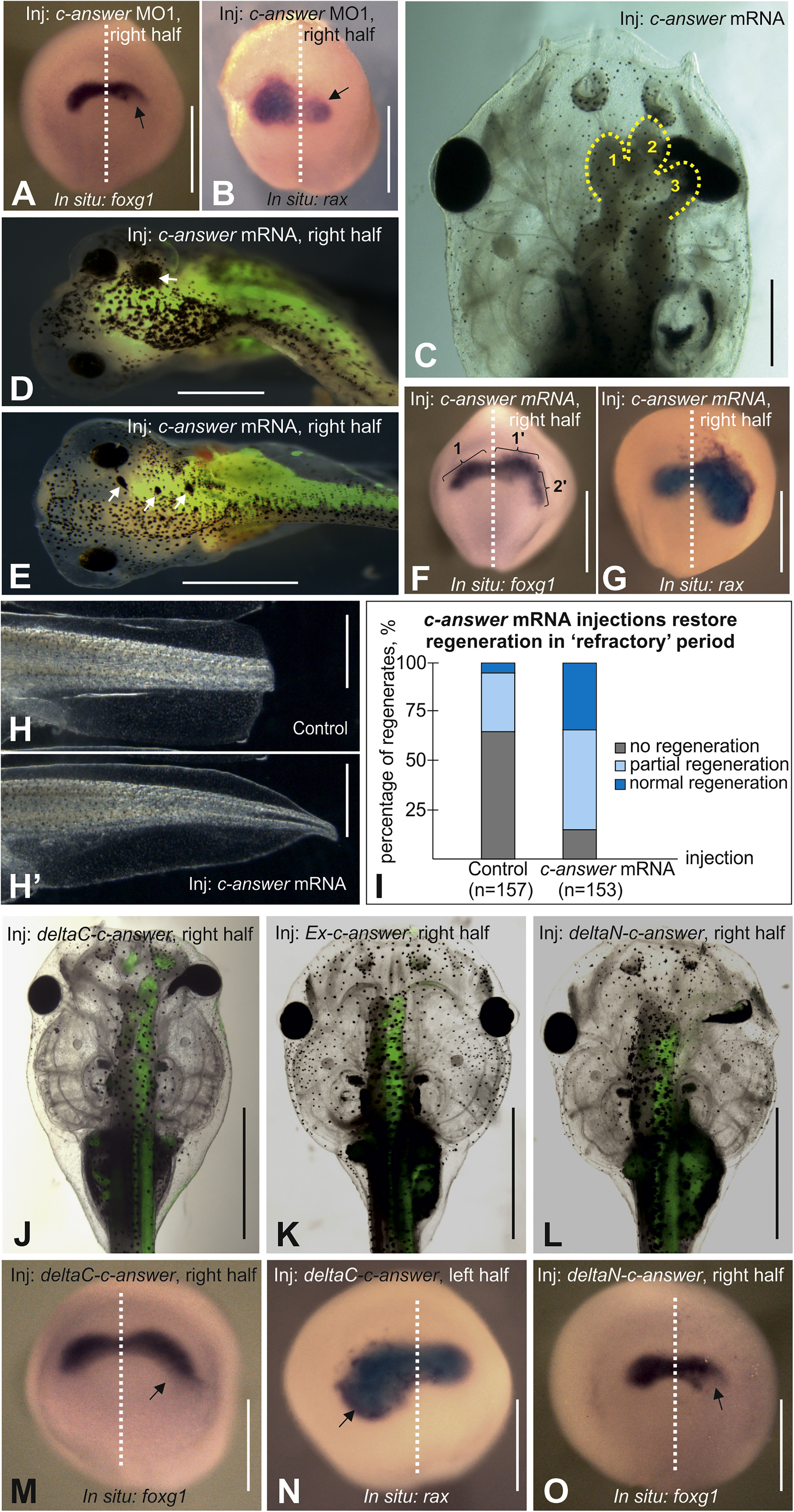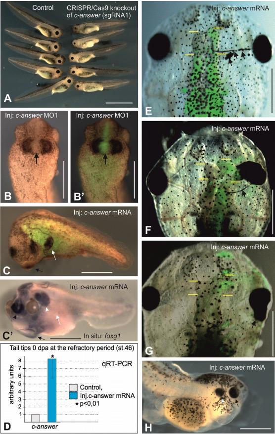 Figure 4. Effects of c-answer Downregulation by Knockdown with Anti-Sense Morpholino Oligonucleotides and the CRISPR/Cas9 Knockout on Tadpole Brain Development and Tail Regeneration (A) c-answer knockdown with c-answer MO1 injections into the dorsal right blastomere at the 4-cell stage results in diminishing of the overall tadpole size, especially of the forebrain and eye (n = 180; 85% morphants), compared to that of the left side (control). Overlay with the fluorescent image demonstrates the distribution of the co-injected tracer FLD. (B) Tadpole in which c-Answer was knocked out in 2nd exon with CRISPR/Cas9 technology has a smaller size then the wild-type tadpole at the same stage. (C, Câ, D, and Dâ) Tail regeneration in tadpoles with c-answer knockdown (C) or knockout (D) is inhibited compared to that of the wild-type control (see E for quantification). (E) Diagram showing the distribution of tail regeneration phenotypes in tadpoles injected with the indicated MO or components of the CRISPR/Cas9 system. (F) Analysis of the indicated marker genes expression by qRT-PCR in tips of the amputated tails of Xenopus laevis tadpoles at stage 41 (see for the scheme of the experiments and for specific primers structures; Ivanova et. al. 2018). The results were normalized by geometric median of odc and ef1alfa housekeeping genes expression described in Ivanova et al. (2013). The expression level of each gene at 0 dpa in the control piece of tissue was taken as one arbitrary unit. Scale bars: 1 mm in (A) and (B) and 250 μm in (C)â(Dâ). Figures S1, S4, S5, and S6. |