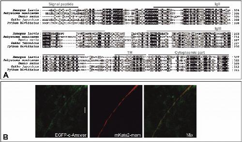 Figure S2. Alignment of c-Answer from different species and its localization in cell membrane, Related to Figure 2. A. Alignment of c-Answer from the indicated could-blooded animals. B. Co-localization of EGFP-c-Answer with cell membrane marker mKate2-mem on cell membrane of the ectodermal cell of Xenopus laevis embryo at the middle gastrula stage. Scale bars on B 200 nm. |
