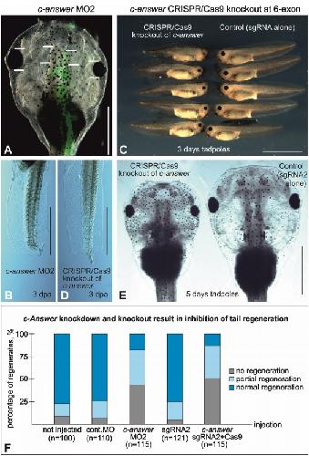 Figure S5. Effects of c-answer downregulation by knockdown with anti-sense morpholino oligonucleotide 2 (MO2) and the CRISPR/Cas9 knockout with sgRNA to the target site in 6th exon on tadpole brain development and tail regeneration, Related to Figure 4. A. c-answer knockdown with c-answer MO2 injections into the dorsal right blastomere at the 4- cell stage results in diminishing of the overall tadpole size, especially of the forebrain and eye, compared to that of the left side (control). Overlay with the fluorescent image demonstrates the distribution of the co-injected tracer FLD. B. Tadpoles in which c-Answer was knocked out in 6th exon with CRISPR/Cas9 technology have smaller size, especially eyes, then the wild-type tadpoles at the same stage. B and D. Tail regeneration in tadpoles with c-answer MO2 knockdown or knockout in 6th exon, respectively, is inhibited compared to that of the wild-type control (see Figure 4). E. Tadpole in which c-Answer was knocked out in 6th exon with CRISPR/Cas9 technology have smaller size then the wild-type tadpoles at the same stage. F. Diagram showing the distribution of tail regeneration phenotypes in tadpoles injected with canswer MO2 or indicated components of the CRISPR/Cas9 system. Scale bars: A, B, D, E 500 µm; C 1mm |