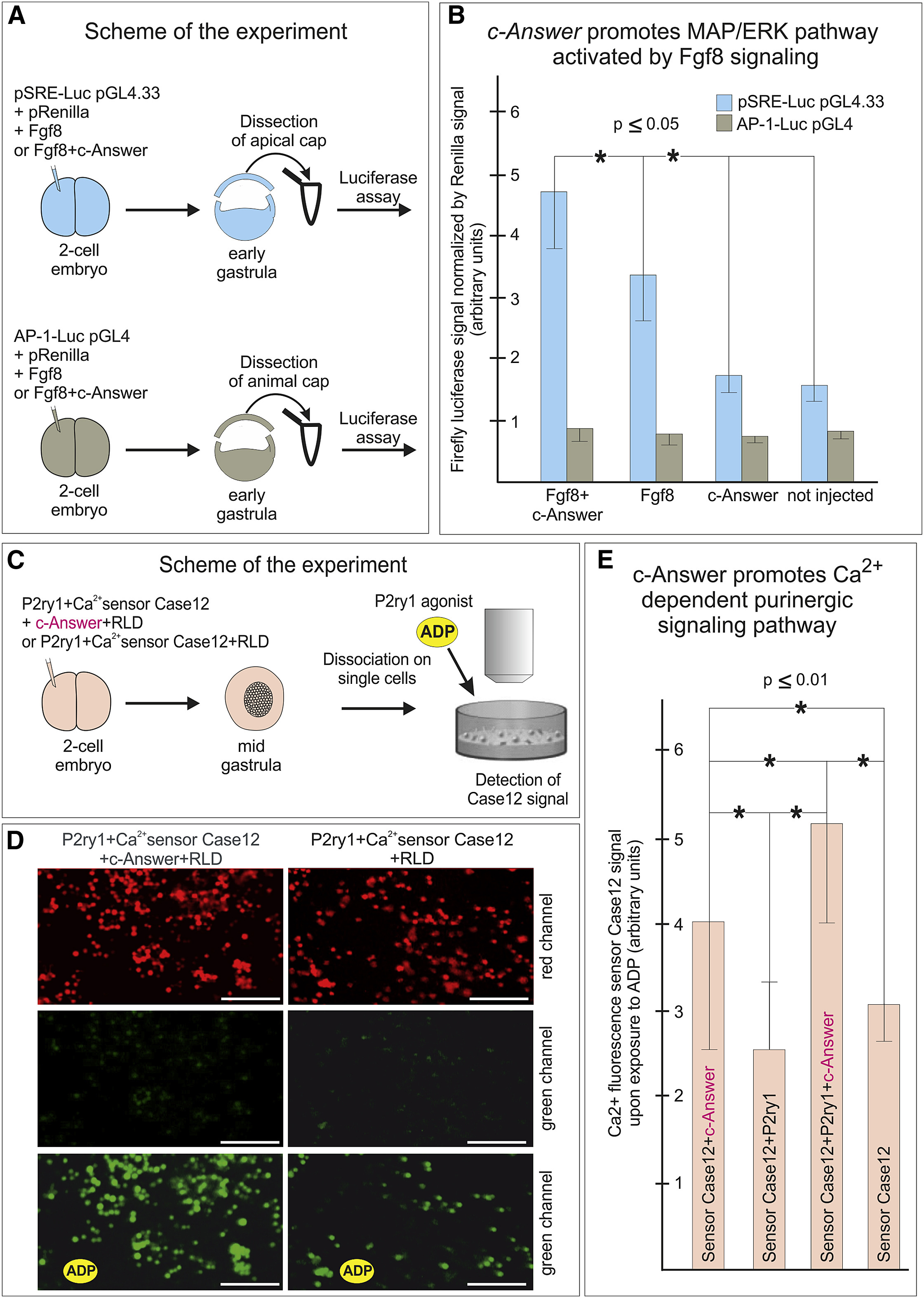 Figure 7. c-Answer Promotes Signaling through the FGFR4 and P2ry1 Receptors, Related to Video S1 and Video S2 (A) Schematic of the experiment performed to analyze the effects of c-Answer on the expression of the MAP/ERK pathway luciferase reporter pSPE-Luc pGL4.33. The stress-activated reporter AP-1-Luc pGL4 was used as a control. (B) Diagram showing the Luc signal analysis results for the two reporters in the animal caps of embryos expressing the indicated proteins. (C) Schematic of the experiment performed to analyze the effects of c-Answer on the Ca2+ flux in response to the addition of the P2ry1 agonist ADP to animal cap cells expressing the Ca2+ sensor Case12 and purinergic receptor P2ry1. (D) Fluorescent images of cells expressing the indicated proteins before and after ADP addition. (E) Diagram showing the results of Case12 signal analysis in animal cap cells expressing the indicated proteins. Scale bars: 200 μm in (D). |