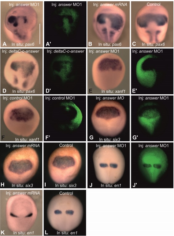 Figure S6. Whole-mount in situ hybridization with probes to the transcripts of the indicated genes of embryos injected with c-answer MO1 or c-answer mRNA variants, Related to Figure 5. A. Inhibition of the pax6 expression on the right side of the middle neurula embryos injected with c-answer MO1 into the right dorsal blastomere at 4-cell stage. Left side is not injected control. A'. The fluorescent image for A demonstrating the distribution of green fluorescent tracer, FLD, co-injected with c-answer MO1. B. Ectopic pax6 expression in the middle neurula embryos injected with c-answer MO1 into 2 blastomeres at 2-cell stage. C. pax6 expression in the control (not injected) middle neurula embryos. D. Ectopic pax6 expression on the right side of the middle neurula embryos injected with deltaCc-answer mRNA into the right dorsal blastomere at 4-cell stage. Left side is not injected control. D'. The fluorescent image for D demonstrating the distribution of green fluorescent tracer, FLD, co-injected with deltaC-c-answer mRNA. E. No effect on xanf1 expression in the middle neurula embryos injected with c-answer MO1 into the left dorsal blastomere at 4-cell stage. E'. The fluorescent image for E demonstrating the distribution of green fluorescent tracer, FLD, co-injected with c-answer MO1. F. No effect on xanf1 expression in the middle neurula embryos injected with the control canswer misMO into the left dorsal blastomere at 4-cell stage. F'. The fluorescent image for F demonstrating the distribution of green fluorescent tracer, FLD, co-injected with c-answer misMO. G. No effect on six3 expression in the middle neurula embryos injected with c-answer MO1 into the right dorsal blastomere at 4-cell stage. G'. The fluorescent image for G demonstrating the distribution of green fluorescent tracer, FLD, co-injected with c-answer MO1. H. No effect on six3 expression in the middle neurula embryos injected with c-answer mRNA into 2 blastomeres at 2-cell stage. I. six3 expression in the control (not injected) middle neurula embryo. J. No effect on en1 expression in the middle neurula embryos injected with c-answer MO1 into 2 blastomeres at 2-cell stage. J can be referred to as not injected control. J'. The fluorescent image for H demonstrating the distribution of green fluorescent tracer, FLD, co-injected with c-answer MO1. K. Inhibition of the en1 expression in the middle neurula embryos injected with c-answer mRNA into 2 blastomeres at 2-cell stage. L. En1 expression in the control (not injected) middle neurula embryo. Scale bars 500 µm for all photos is shown on A. |