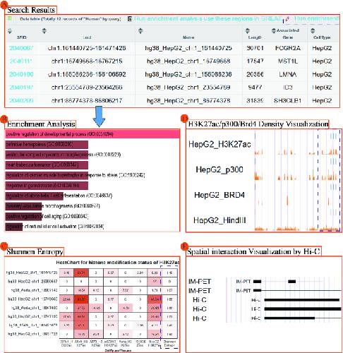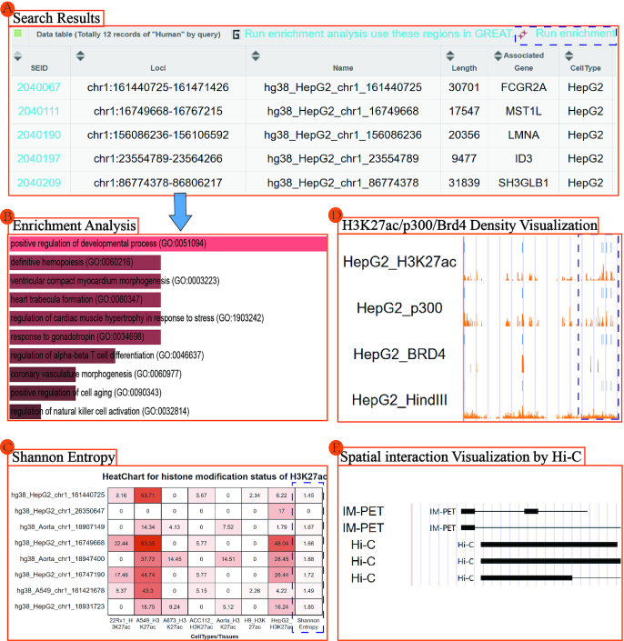 Figure 3. A case application showing select SEA v. 3.0 features. (A) Super-enhancers with related coding genes computationally recognized by p300 in chromosome 1 of the human HepG2 cell line. (B) Enrichment analysis of super-enhancer related genes through the Enrichr interface. (C) Cell type specificity of super-enhancers computed by Shannon Entropy. (D) H3K27ac, p300Â and Brd4 density of HepG2 super-enhancers visualized in the genome browser. (E) Spatial interaction visualization by Hi-C in the genome region âchr1:156864585â156975979â.