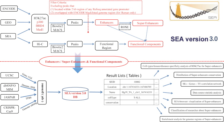 Figure 1. Database content and construction. SEA v. 3.0 takes advantage of available public H3K27ac, BRD4, Med1 and p300 ChIP-Seq datasets to identify super-enhancers in different cell types/tissues/diseases of 11 species. It excludes peaks located within ±2 kb of any RefSeq annotated gene promoter or peaks overlapping with ENCODE blacklisted genomic regions. Multiple track types are used for genomic visualization including functional components generated by Hi-C datasets. Shannon Entropy is used to calculate and evaluate the cell type specificity of super-enhancers, and all data are accessible through the download page.