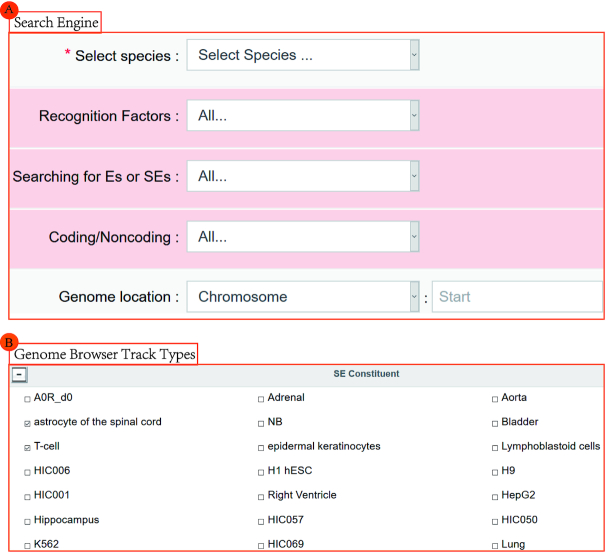 Figure 2. SEA v. 3.0 update modules. (A) Searching engine updates added three query options. (B) New track types updates include SE constituent computed by Hi-C in multiple cell types and 4D Genome.
