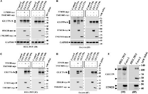 FIGURE 1. Physical interaction between GLUT9 isoforms and ITM2B-myc or TMEM85-myc: (A) Western blot analyses of the lysates of transiently transfected HEK 293T cells, co-expressing GLUT9a/b and ITM2B/TMEM85-myc, using anti-GLUT9 antibody and anti-myc antibody respectively. (B) Western blot analyses of the lysates of microinjected oocytes co-expressing GLUT9a/b and ITM2B/TMEM85-myc. Each oocyte was microinjected with 12.5 ng of GLUT9a/b cRNA or a mixture containing 12.5 ng of GLUT9a/b cRNA and 12.5 ng of ITM2B/TMEM-myc cRNA. GAPDH protein band for each sample acts as a loading control. (C) Co-immunoprecipitation of GLUT9a/b with ITM2B/TMEM85-myc, using sepharose bead conjugated mouse anti-Myc antibody, from lysates of co-transfected HEK 293T cells co-expressing GLUT9a/b and ITM2B/TMEM85-myc. GLUT9 isoforms were detected by Western blotting using rabbit anti-GLUT9 antibody. (D) Co-immunoprecipitation of GLUT9a/b with ITM2B/TMEM85-myc, from lysates of Xenopus laevis oocytes co-expressing GLUT9a/b and ITM2B/TMEM85-myc. (E) Left panel: Western blot analyses of the lysates (60 μg total protein/lane) of HEK 293T and Caco-2 for endogenous GLUT9 and ITM2B proteins using anti-GLUT9 antibody and anti-ITM2B antibody respectively. Right panel: Endogenous GLUT9 was co-immunoprecipitated with endogenous ITM2B from the lysates of HEK 293T or Caco-2 cells using mouse anti-ITM2B antibody and sepharose (R) bead conjugated anti-mouse IgG antibody, F(abâ)2 fragment. GLUT9 was detected by immunoblotting using rabbit anti-GLUT9 antibody and ITM2B by rabbit anti-ITM2B antibody. IB, immunoblotting; IP, immunoprecipitation.