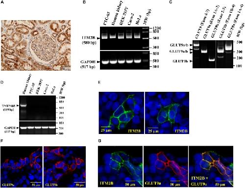 FIGURE 2. ITM2B and SLC2A9 gene expression in human renal proximal tubule cells: (A) Immunohistochemistry of human kidney section with anti-ITM2B antibody at 20X magnification. ITM2B protein expression (dark brown) is detected in renal proximal tubule epithelial cells. (B) RT-PCR detection of ITM2B and GAPDH mRNAs in human kidney, human proximal tubule epithelial cells (PTC-05), HEK 293T, Caco-2, and HeLa cells; GAPDH mRNA expression acts as a control. (C) RT-PCR detection of mRNA expression of GLUT9a and GLUT9b in PTC-05 cells. (D) RT-PCR detection of TMEM85 mRNA in human kidney with no expression in the cell lines tested here. (E) Cell membrane localization of ITM2B-myc protein in transiently transfected HEK 293T cells by confocal immunofluorescence microscopy using Alexa Fluor 488 conjugated mouse anti-myc antibody. (F) Cell membrane localization of GLUT9a and GLUT9b proteins in transiently transfected HEK 293T cells by confocal immunofluorescence microscopy using rabbit anti-GLUT9 antibody and Alexa Fluor 594 conjugated anti-rabbit IgG, F(abâ) fragment. (G) Cell membrane localization of GLUT9a and ITM2B-myc proteins in transiently transfected HEK 293T cells co-expressing both proteins by confocal immunofluorescence microscopy: GLUT9 protein (red) was detected using rabbit anti-GLUT9 antibody and Alexa Fluor 594 conjugated anti-rabbit IgG and ITM2B-myc (green) was detected using Alexa Fluor 488 conjugated mouse anti-myc antibody. The rightmost panel shows the merged images of ITM2B-myc and GLUT9a protein localization.