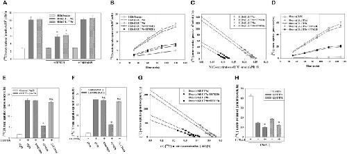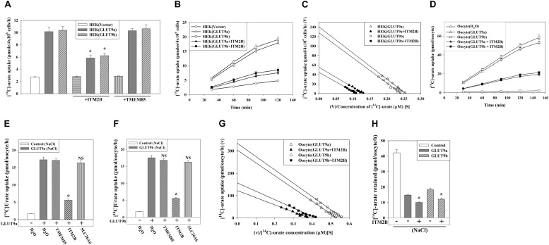 FIGURE 3. ITM2B inhibits [14C]-urate uptake and stimulates [14C]-urate efflux mediated by human GLUT9 isoforms. (A) The [14C]-urate uptake activity of GLUT9a/b expressed alone or co-expressed with ITM2B/TMEM85 in transiently transfected HEK 293T cells (4 à 106) was measured in an isotonic uptake medium containing 20 μM [14C]-urate for 1 h at â¼25°C. (B) The time course plot of [14C]-urate uptake mediated by GLUT9a/b expressed alone or co-expressed with ITM2B in transiently transfected HEK 293T cells (4 à 106). (C) ITM2B inhibits [14C]-urate uptake mediated by GLUT9a/b following a non-competitive inhibition (mixed) model. The Eadie-Hofstee plot of [14C]-urate uptake mediated by GLUT9a/b expressed alone or co-expressed with ITM2B in transiently transfected HEK 293T cells (4 à 106). V, the [14C]-urate uptake rate in pmol/4 à 106 cells/h; V/S, [14C]-urate uptake rate per concentration (mM) of [14C]-urate (S). (D) The time course plot of [14C]-urate uptake mediated by GLUT9a/b expressed alone or co-expressed with ITM2B in Xenopus laevis oocytes measured in an isotonic uptake medium containing 40 μM [14C]-urate for 1h at â¼25°C. (E) The [14C]-urate uptake activity of GLUT9a expressed alone or co-expressed with ITM2B, TMEM85 or a transmembrane protein (SLC26A6) in oocytes was measured in membrane-polarized oocytes (ND96 medium). (F) The [14C]-urate uptake activity of GLUT9b expressed alone or co-expressed with ITM2B, TMEM85 or SLC26A6 in oocytes was measured in membrane-polarized oocytes. (G) ITM2B inhibits [14C]-urate uptake mediated by GLUT9a/b following a non-competitive inhibition (mixed) model. The Eadie-Hofstee plot of [14C]-urate uptake mediated by GLUT9a/b expressed alone or co-expressed with ITM2B in oocytes. (H) ITMB stimulates urate efflux mediated by GLUT9 isoforms. Each oocyte was microinjected with 50 nl of cRNA solution containing 12.5 ng of GLUT9a/b cRNA or a mixture of 12.5 ng of GLUT9a/b cRNA and 12.5 ng of ITM2B/TMEM85/SLC26A6 cRNA. The [14C]-urate efflux mediated by GLUT9a/b expressed alone or co-expressed with ITM2B in oocytes was measured in membrane-polarized oocytes for 1 h at â¼25°C. For the [14C]-urate efflux experiment, each oocyte was pre-injected with 50 nl of 1500 μM [14C]-urate. âP < 0.001 compared with urate efflux in absence of ITM2B.