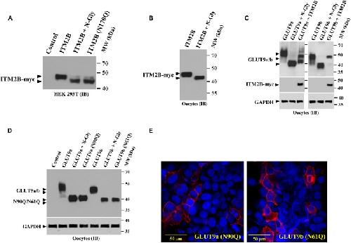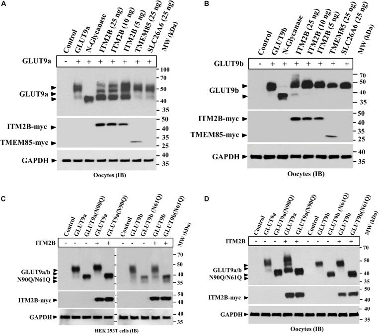 FIGURE 5. ITM2B differentially affects the N-linked glycosylation level of GLUT9 isoforms in oocytes. (A) Western blot analysis of lysates of oocytes expressing GLUT9a alone, or co-expressing GLUT9a and varying amount of ITM2B or fixed amount of other control transmembrane proteins as shown. GAPDH protein band acts as a loading control. For the expression of GLUT9a alone, each oocyte was microinjected with 25 ng of GLUT9a cRNA. For co-expression of GLUT9a with ITM2B, each oocyte was microinjected with a mixture containing 25 ng of GLUT9a cRNA and 5â25 ng of ITM2B cRNA. For co-expression of GLUT9a with TMEM85 or SLC26A6, each oocyte was microinjected with a mixture of 25 ng each of GLUT9a cRNA and TMEM85 or SLC26A6 cRNA. (B) Western blot analysis of lysates of oocytes expressing GLUT9b alone, or co-expressing GLUT9b and varying amount of ITM2B or fixed amount of other control transmembrane proteins as shown. GAPDH protein band acts as a loading control. (C) Western blot analysis of lysates of transiently transfected HEK 293T cells expressing GLUT9a/b, or their respective N-glycosylation-deficient mutants or co-expressing ITM2B-myc with GLUT9a/b, or their respective N-glycosylation-deficient mutants. (D) Western blot analysis of lysates of oocytes expressing GLUT9a/b, or their respective N-glycosylation-deficient mutants or co-expressing ITM2B-myc with GLUT9a/b, or their respective N-glycosylation-deficient mutants. GLUT9 isoforms were detected by immunoblotting using rabbit anti-GLUT9 antibody and ITM2B-myc and TMEM85-myc were detected using rabbit anti-myc antibody. IB, immunoblotting.