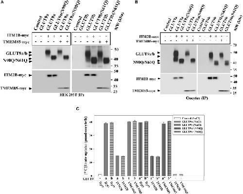 FIGURE 6. ITM2B physically interacts with N-glycosylation-deficient mutants of GLUT9 isoforms and efficiently inhibits their urate transport function. (A) Co-immunoprecipitation of GLUT9a/b or their respective N-glycosylation-deficient mutant (GLUT9a-N90Q or GLUT9b-N61Q) with ITM2B/TMEM85-myc, using mouse anti-Myc antibody conjugated with sepharose beads, from lysates of transiently co-transfected HEK 293T cells co-expressing GLUT9a/b or their respective mutants and ITM2B/TMEM85-myc. (B) Co-immunoprecipitation of GLUT9a/b or their respective N-glycosylation-deficient mutant with ITM2B/TMEM85-myc. The co-immunoprecipitated GLUT9 isoforms or their respective mutants were immunodetected by Western blotting using rabbit anti-GLUT9 antibody and ITM2B/TMEM85-myc was detected using rabbit anti-Myc antibody. (C) The [14C]-urate uptake activity of GLUT9 isoforms or their respective N-glycosylation-deficient mutants, expressed alone or co-expressed with ITM2B/TMEM85, measured in ND96 medium. Each oocyte was microinjected with 50 nl of cRNA solution containing 12.5 ng cRNA of GLUT9a/GLUT9b or the cRNA of their respective mutant or a mixture containing 12.5 ng of GLUT9a/GLUT9b cRNA or the cRNA of their respective mutant and 12.5 ng of cRNA of ITM2B/TMEM85-myc. IP, immunoprecipitation.