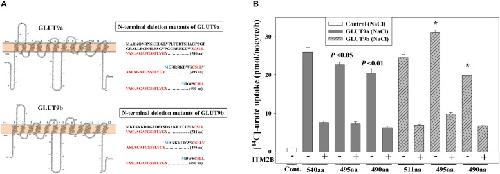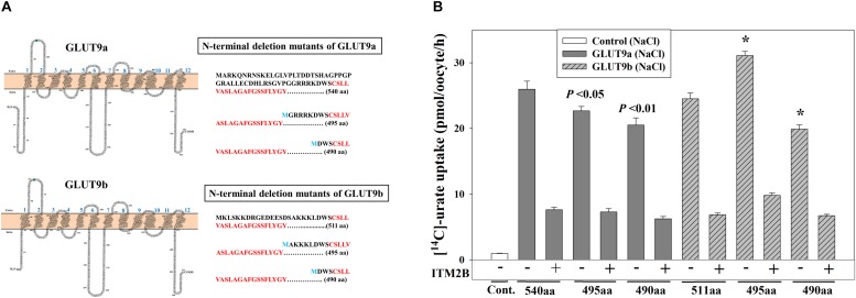 FIGURE 7. ITM2B inhibits the urate transport activity of N-terminal deletion mutants of GLUT9 isoforms. (A) Predicted membrane topology model of the isoforms of GLUT9 (GLUT9a and GLUT9b) with 12 hydrophobic transmembrane domains are shown at the left panels. The N-glycosylation site (confirmed by mutational analyses shown in Figure 4D) in the first extracellular loop was highlighted green. The amino acid (aa) sequences of the N-terminal cytoplasmic part of the GLUT9a/b (540/511 aa) and their respective N-terminal deletion mutants (495/490 aa) with starting amino acid M (marked blue) were shown at the right panels with the first transmembrane hydrophobic domains as marked bold red. (B) The [14C]-urate uptake activity of GLUT9a, GLUT9b, N-terminal deletion mutants of GLUT9a and GLUT9b, expressed alone or co-expressed with ITM2B in Xenopus oocytes, was measured in ND96 medium. Each oocyte was microinjected with 50 nl of cRNA solution containing 12.5 ng cRNA of GLUT9a/b or their respective N-terminal deletion mutants. For co-expression of GLUT9 or its mutants with ITM2B, each oocyte was microinjected with 50 nl of cRNA solution containing 12.5 ng of GLUT9a/b or their respective N-terminal deletion mutants and 12.5 ng of ITM2B cRNA. âP < 0.001 compared with the respective urate uptake mediated by GLUT9a(540aa) or GLUT9b(511aa).
