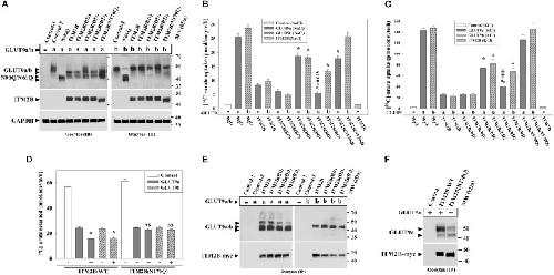 FIGURE 8. ITM2B mutants associated with familial Danish dementia (FDD), retinal dystrophy (FRD) or N-glycosylation (ITM2B-N170Q) exhibit attenuated inhibition of urate uptake by GLUT9 isoforms. (A) Western blot analyses of lysates of oocytes expressing GLUT9a/b or co-expressing GLUT9a/b and ITM2B-myc or myc-tagged mutants of ITM2B associated with familial British dementia (FBD), FDD, FRD or N-glycosylation (N170Q) in Xenopus oocytes. GAPDH protein band acts as a loading control. (B) The [14C]-urate uptake activity of GLUT9 isoforms expressed alone or co-expressed with ITM2B or its mutants associated with FBD, FDD, FRD or N-glycosylation (N170Q), was measured in ND96 medium. âP < 0.001 compared with urate uptake in presence of normal ITM2B. (C) The [14C]-urate transport activity of GLUT9 isoforms expressed alone or co-expressed with ITM2B or mutants of ITM2B, was measured in membrane-depolarized oocytes (in Na+-free medium containing 98 μM KCl). Note that ITM2B showed proportionate inhibition in both membrane-polarized and depolarized oocytes (Na+-free medium containing 98 μM KCl). âP < 0.001 compared with urate uptake mediated by GLUT9 in presence of normal ITM2B. (D) ITMB stimulates urate efflux mediated by GLUT9 isoforms but the ITM2B(N170Q) does not. For [14C]-urate efflux experiment in Xenopus laevis oocytes, each oocyte was pre-injected with 50 nl of 1500 μM [14C]-urate and then subjected to urate efflux for 1h in ND96 medium. âP < 0.001 compared with urate efflux mediated by GLUT9 in absence of ITM2B. NS, statistically non-significant. (E) Co-immunoprecipitation of GLUT9a/b with myc-tagged ITM2B or its mutants, from lysates of oocytes co-expressing GLUT9a/b and ITM2B-myc or its mutants. Each oocyte was microinjected with 50 nl of cRNA solution containing 12.5 ng of GLUT9a/b cRNA or a mixture of cRNAs containing 12.5 ng of GLUT9a/b cRNA and 12.5 ng of cRNA of ITM2B or its mutants. (F) Co-immunoprecipitation of GLUT9a with ITM2B-myc or ITM2B(N170Q)-myc, from lysates of oocytes co-expressing GLUT9a and ITM2B-myc or ITM2B(N170Q)-myc. GLUT9 isoforms were immunodetected by Western blotting using rabbit anti-GLUT9 antibody and ITM2B-myc or myc-tagged ITM2B mutant was immunodetected using rabbit anti-Myc antibody. IB, immunoblotting; IP, immunoprecipitation.